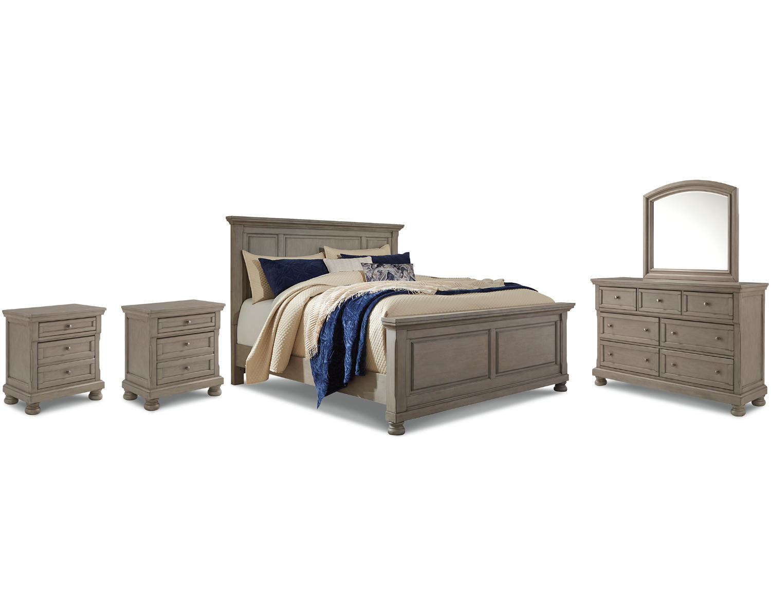 Lettner Queen Panel Bed, Dresser, Mirror and 2 Nightstands — Light Gray