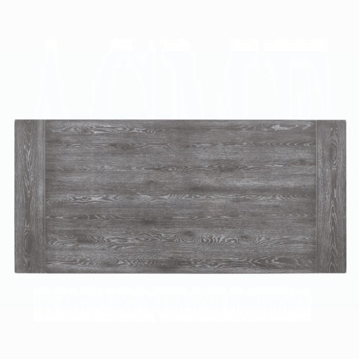 - Distinctive silhouette: rectangular table with a trestle base and turned pedestals in a weathered gray finish.