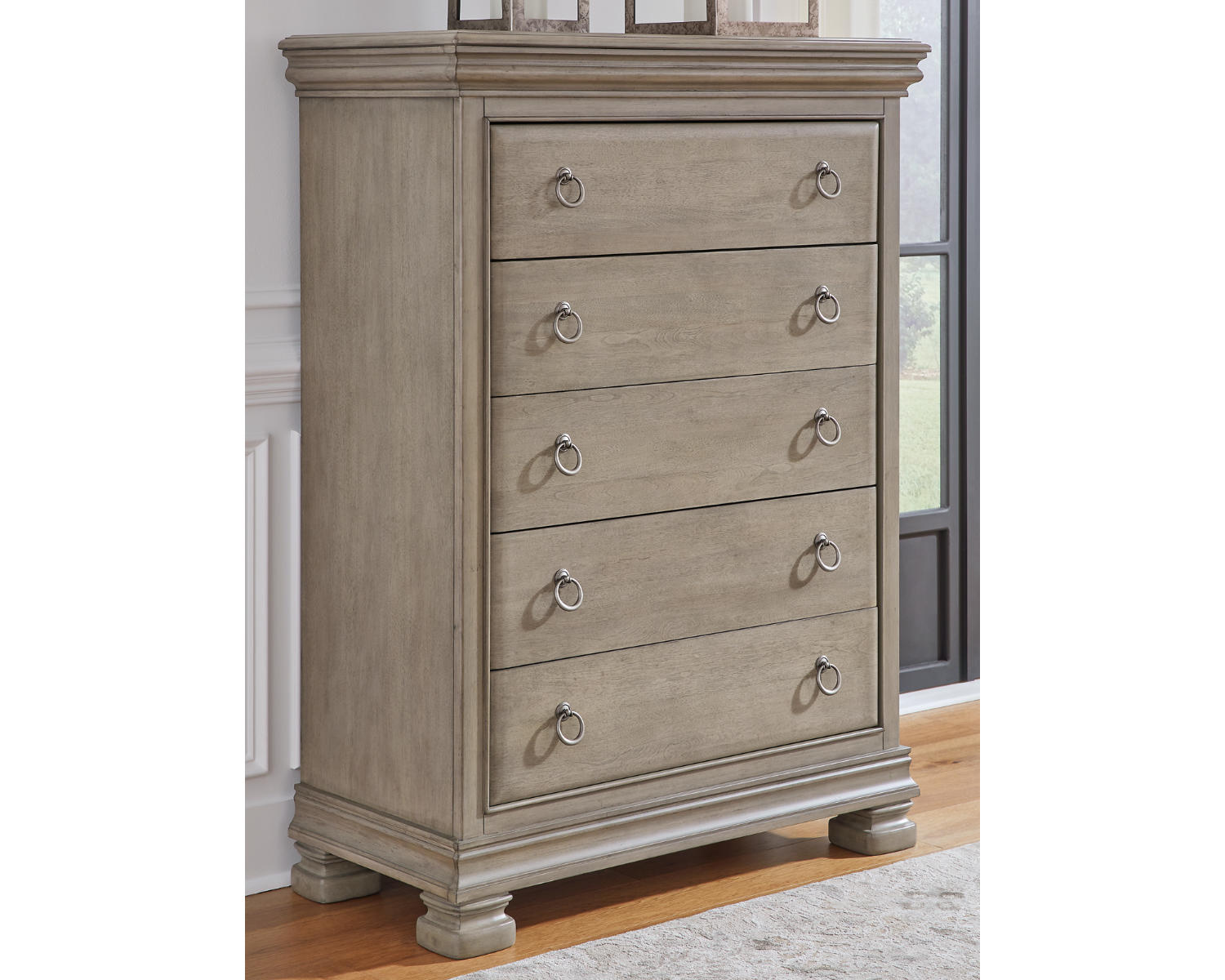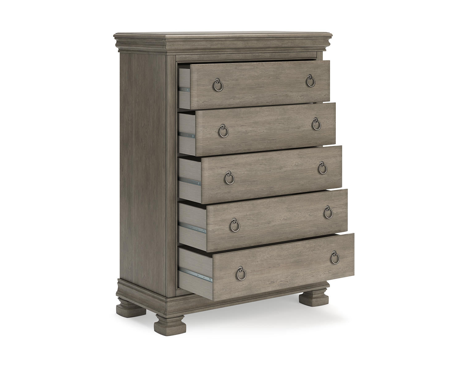 The Lexorne Chest of Drawers is a versatile storage piece designed for modern bedrooms. This five-drawer chest in gray offers organized, accessible storage for clothing, linens, and accessories, blending clean lines with functional design.