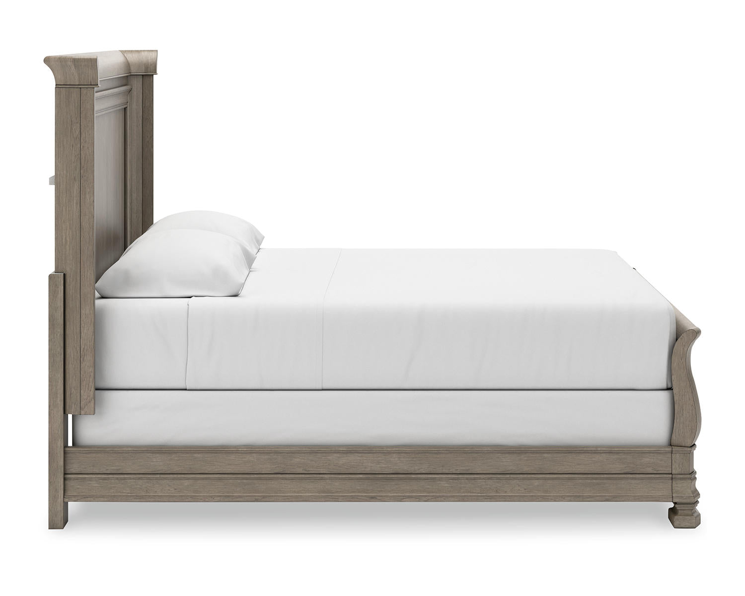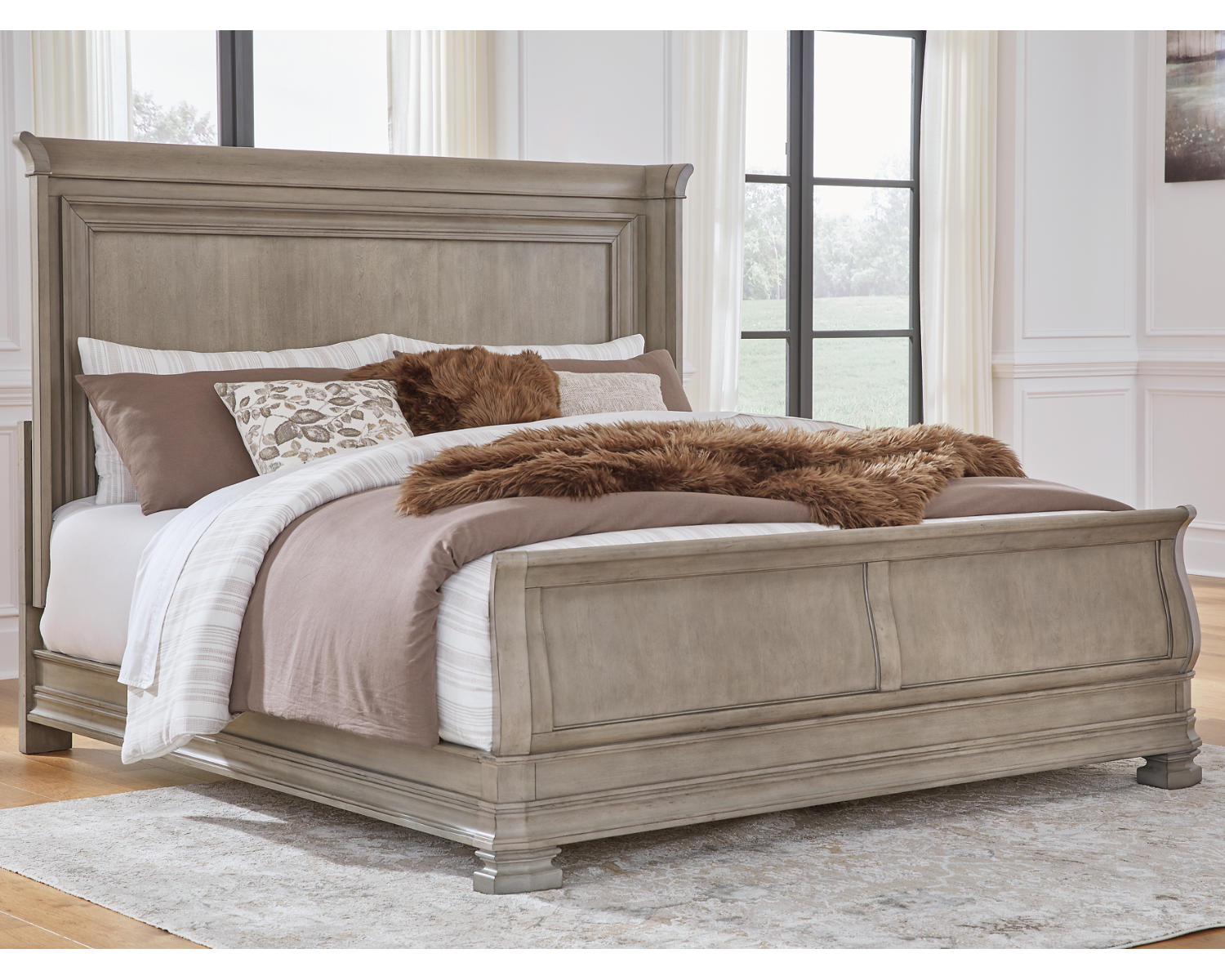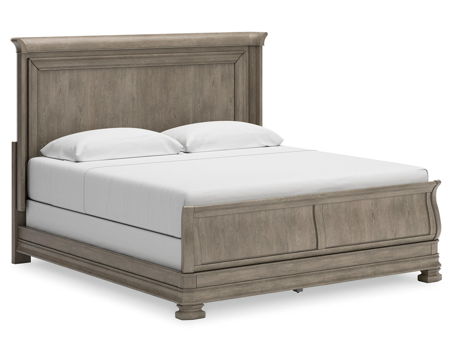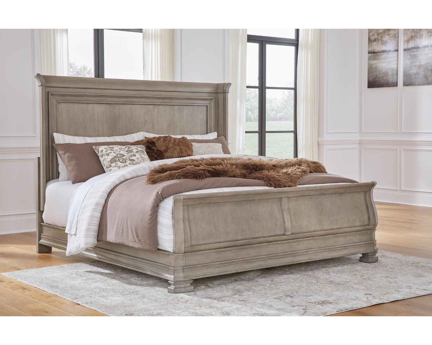 Elevate your master suite with the Lexorne King Sleigh Bed in a sophisticated gray finish. This king-size bed combines classic sleigh-bed curves with modern neutral styling, creating a versatile centerpiece for sleeping sanctuaries and guest rooms alike.