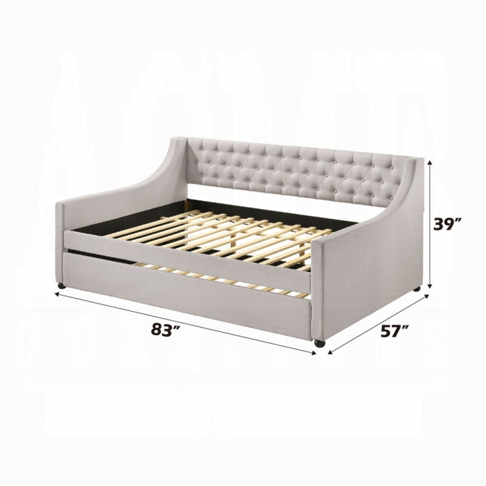 Lianna Daybed with Trundle in Full blends a classic silhouette with rich textures. This fully upholstered daybed is ideal for guest rooms, living spaces, or home offices that double as sleeping areas. The wooden frame features gentle curves and refined detailing, while the button-tufted fog fabric upholstery invites luxurious comfort. A discreet trundle underneath provides extra sleeping space for overnight guests.