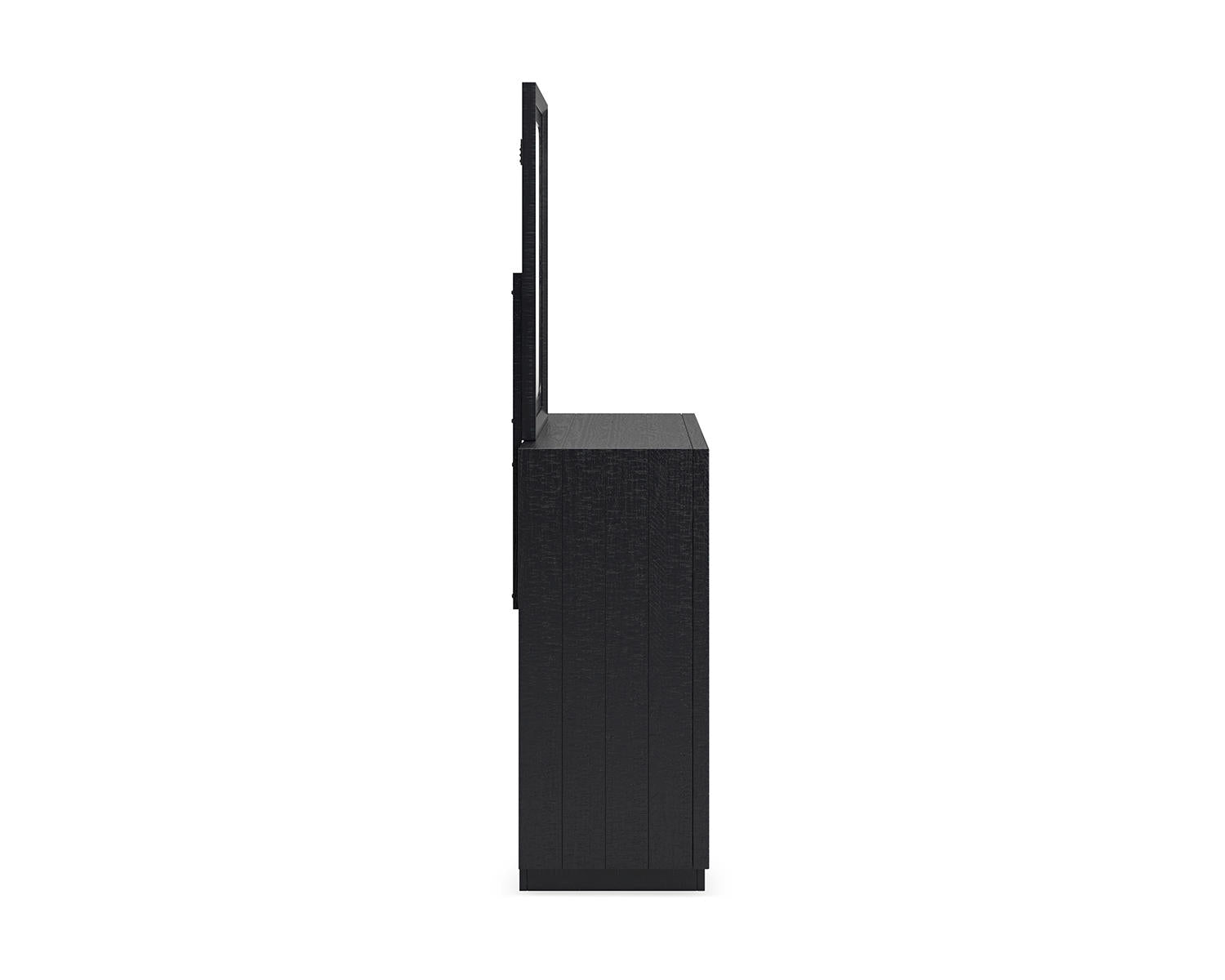 - Black finish across bed, dresser, and mirror for a cohesive, contemporary aesthetic