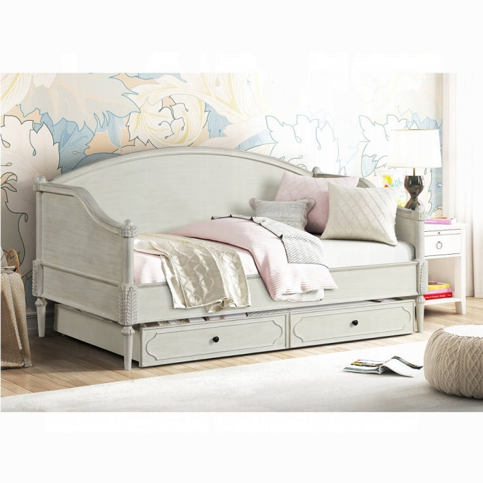 Elegance meets everyday living in the Lucien Trundle Twin daybed. Finished in antique white, it pairs classic charm with practical function. The optional trundle adds extra sleeping space when guests arrive, while carved floral accents provide a timeless focal point.