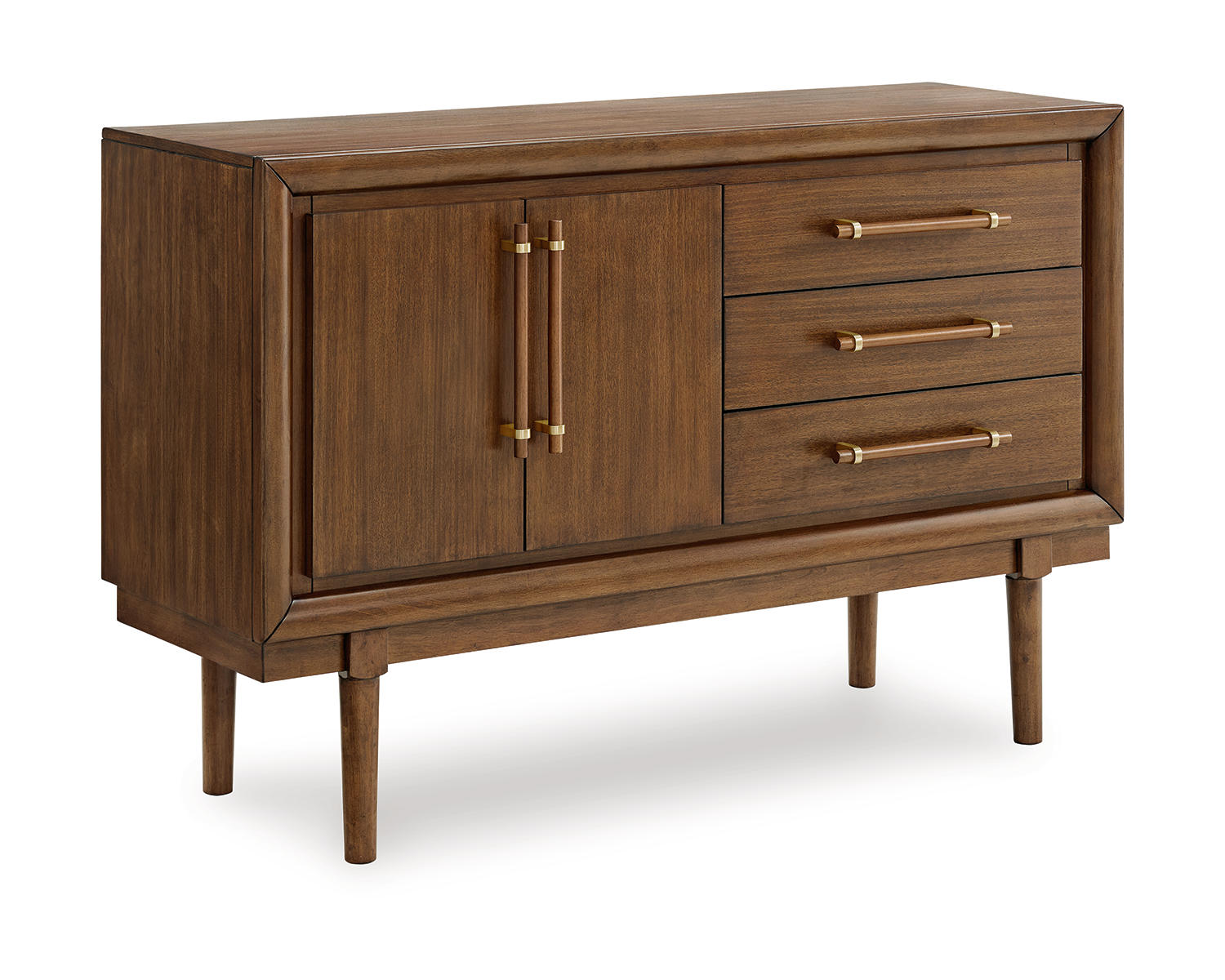 The Lyncott Dining Server in a rich brown finish brings functional storage and classic style to your dining room. Designed for everyday meals and casual entertaining, it blends seamlessly with a variety of decors. This versatile piece offers a tidy surface for serving and a reliable home for essentials between uses.