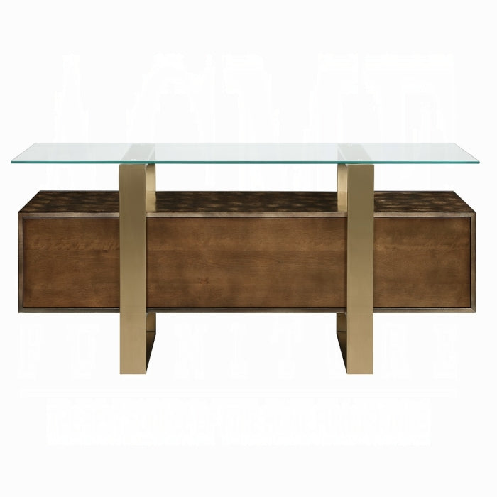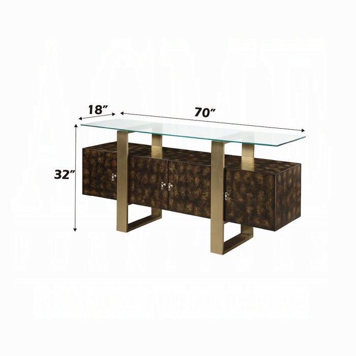 Elevate your home with the Mabyn console cabinet. This piece blends brass with an antique finish for a contemporary, worldly appeal, offering generous display space and storage. The sleek tempered glass tabletop creates the illusion of a floating surface, while the elegant brass base provides lasting support.