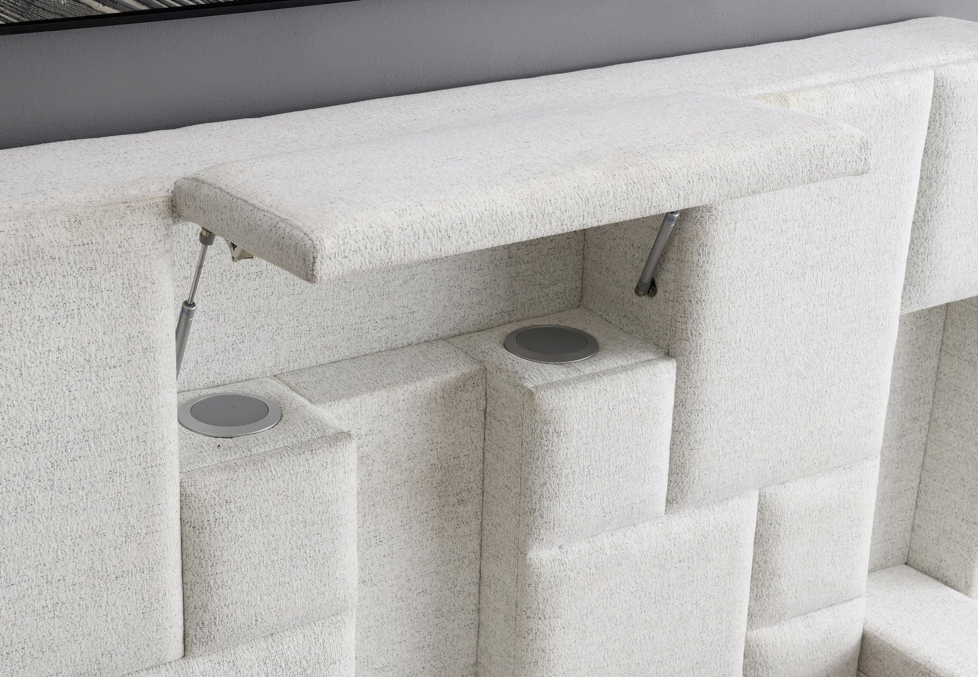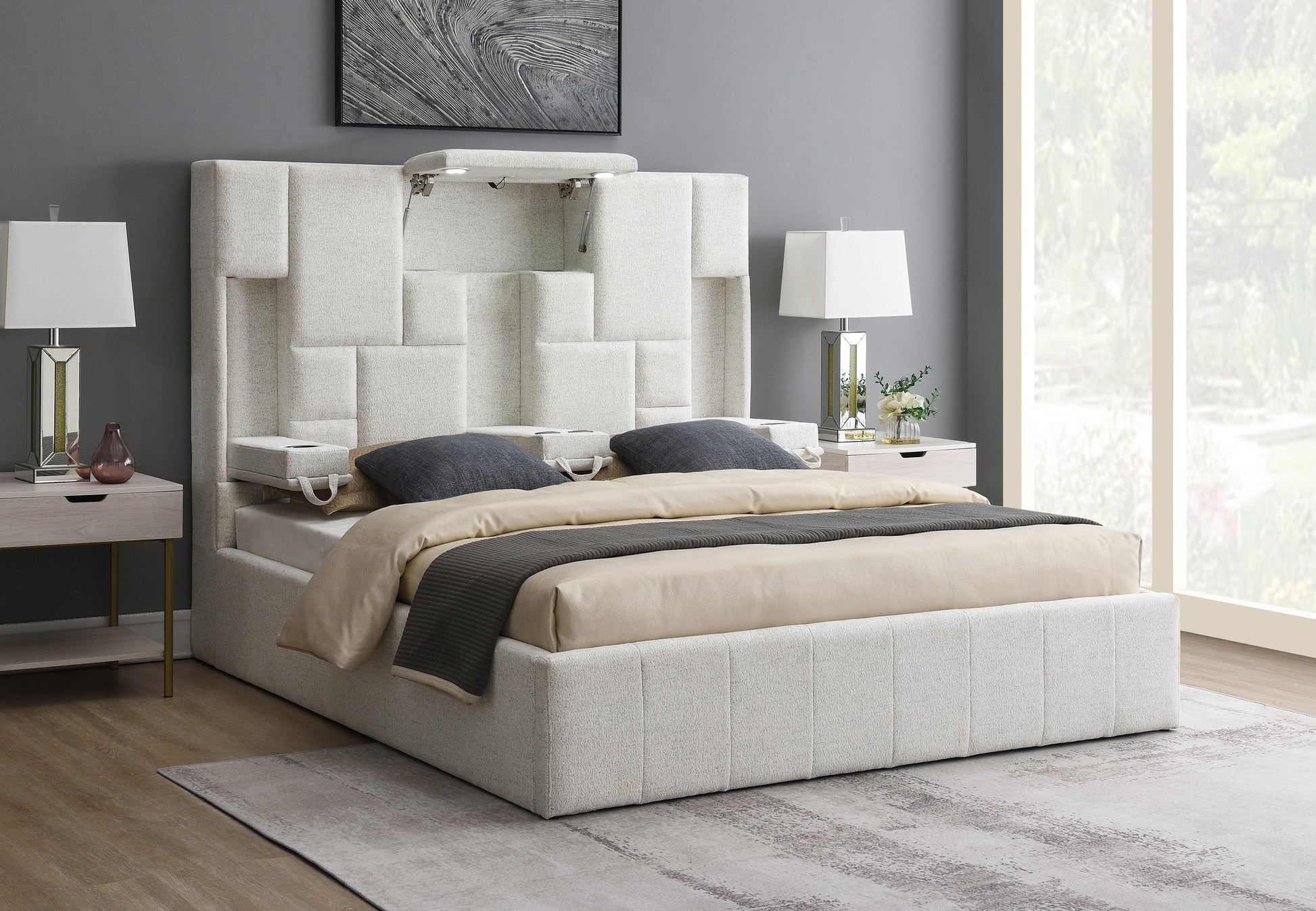 Experience modern comfort with this ivory upholstered bed featuring a uniquely designed headboard. The geometric panel design adds a contemporary flair, making it a perfect fit for minimalist or modern decor. Hidden functionality elevates its appeal with built-in compartments in the headboard for storage.