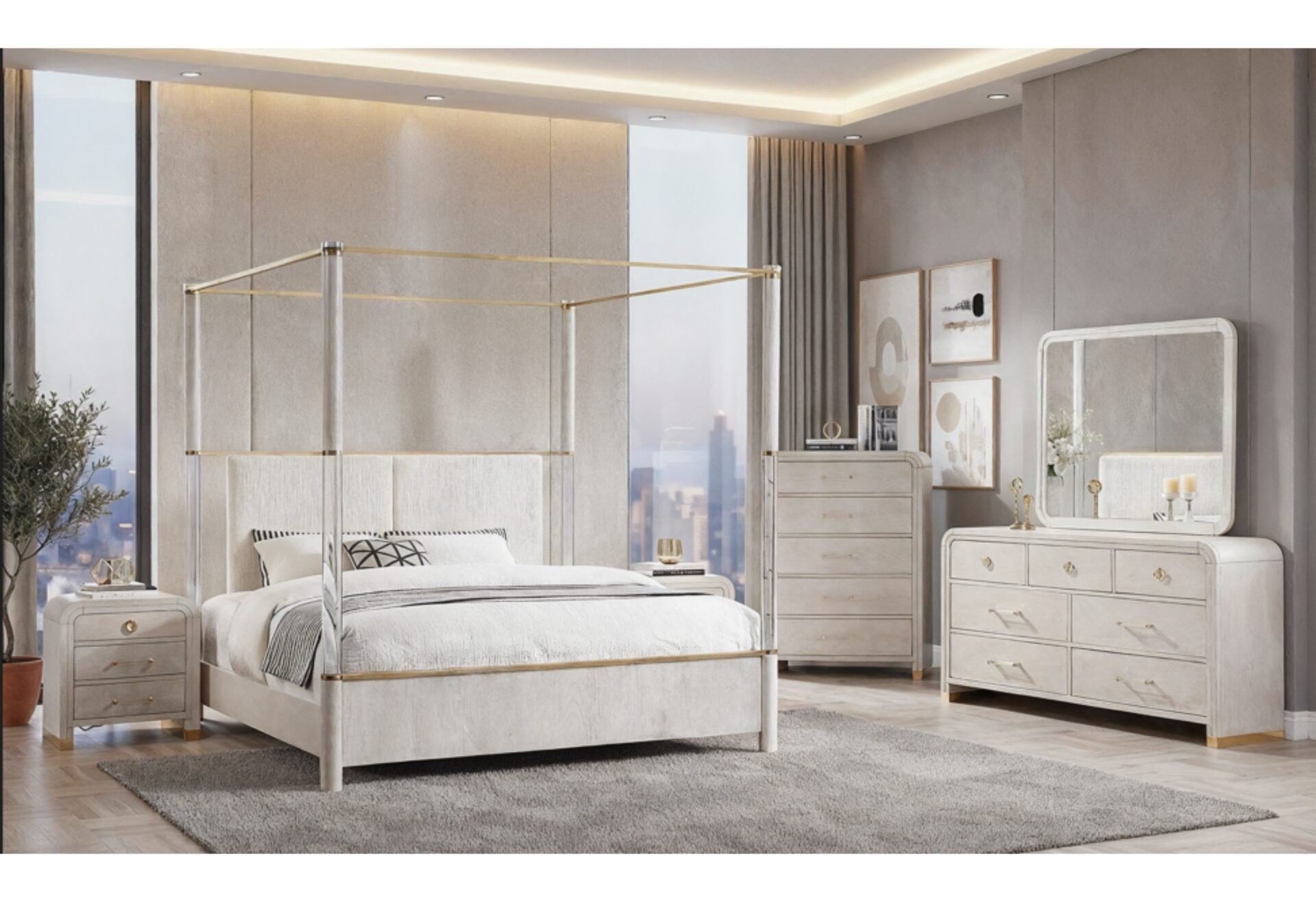 Redefine elegance in your home with the Malmo Bedroom Set by Global Furniture USA. Crafted in a warm light beige oak veneer, this collection blends modern glamour with timeless sophistication. The striking canopy bed serves as the centerpiece, featuring acrylic posts accented with gleaming gold trim along the canopy, headboard, and footboard. The upholstered beige textured headboard adds a layer of comfort and refinement, while the fully slatted design ensures lasting support.