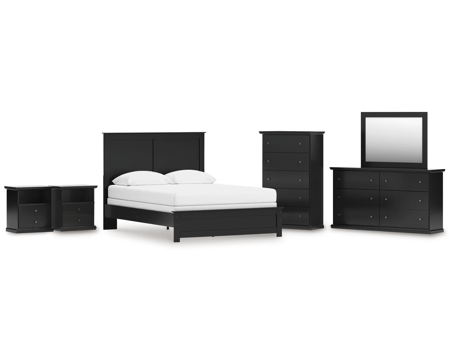 Meet the Maribel bedroom suite—a complete, coordinated solution designed for standard-size bedrooms. This set includes a Queen Panel Bed, a Dresser, a Mirror, a Chest, and two Nightstands, delivering a unified look with practical storage.