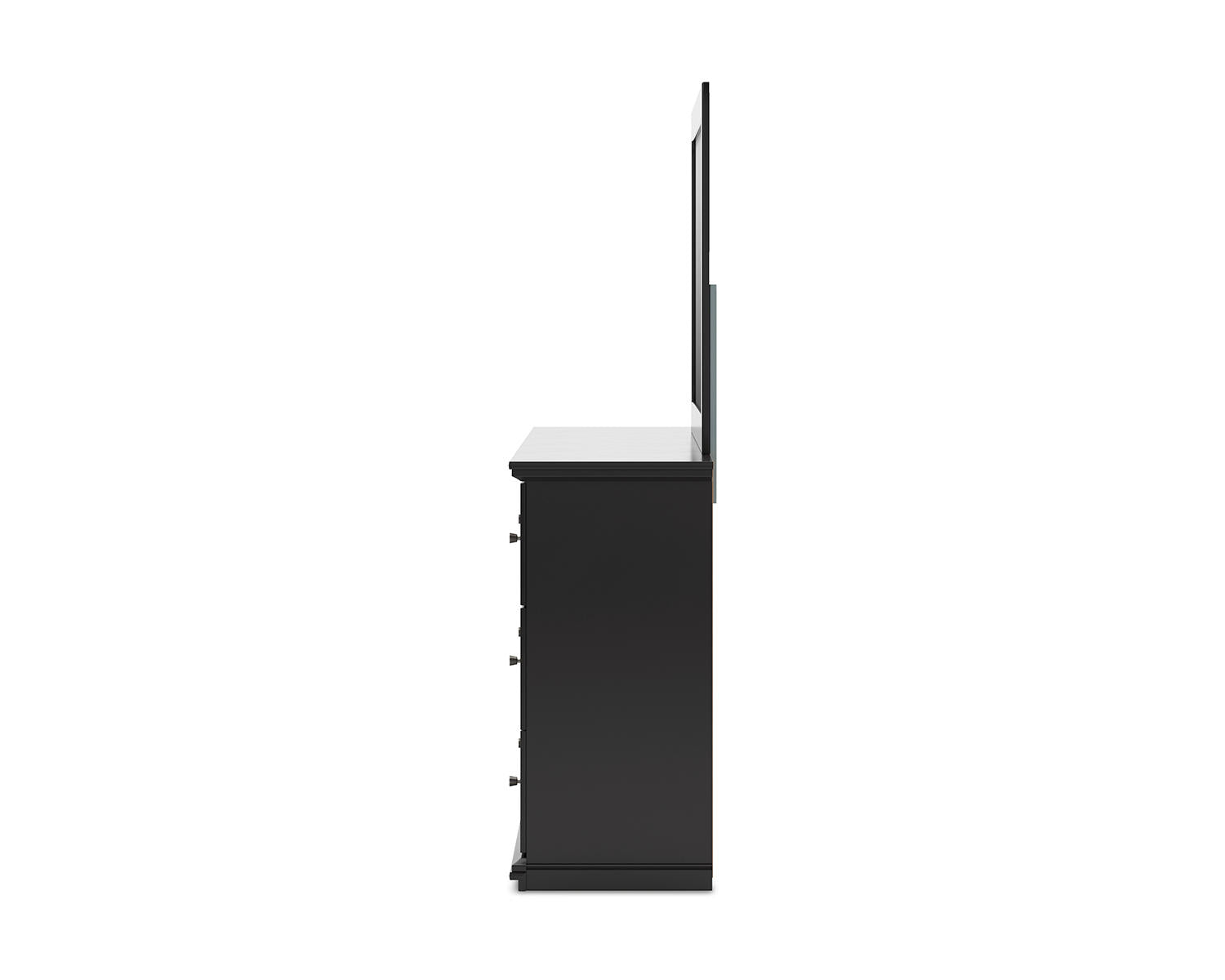 - Queen panel bed accompanied by a dresser, mirror, and nightstand for a complete bedroom solution