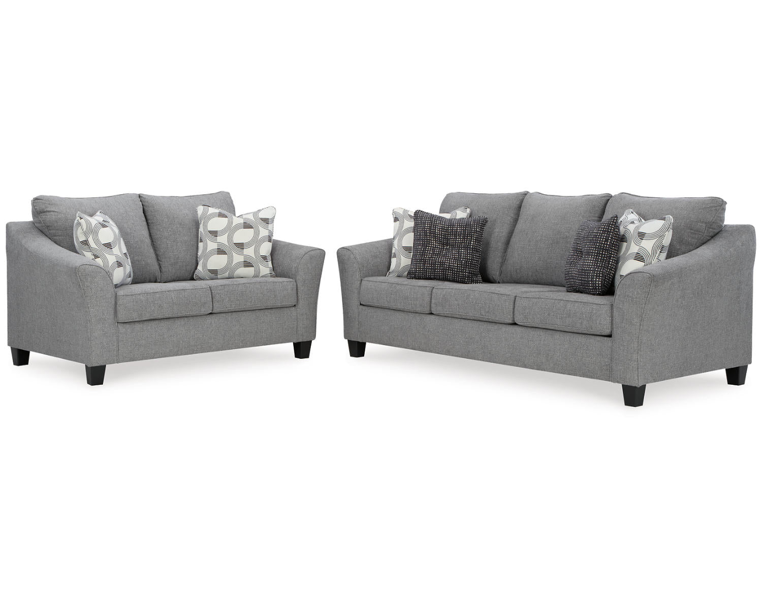 Meet the Mathonia Sofa and Loveseat, a versatile seating duo designed for modern living spaces. The set is finished in Smoke, offering a sophisticated, neutral tone that pairs with a wide range of decor. This pair is ideal for living rooms, family rooms, or lounge areas that value both comfort and style.