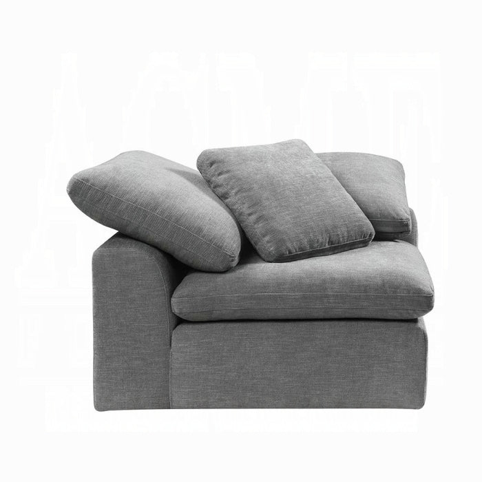 Complete your living room with the unique design and sink-in comfort of the Naveen modular collection. This wedge-based configuration, paired with an armless chair and ottoman, blends contemporary and modern taste wrapped in a relaxing hue fabric. Create a customizable seating arrangement that fits your space and lifestyle.