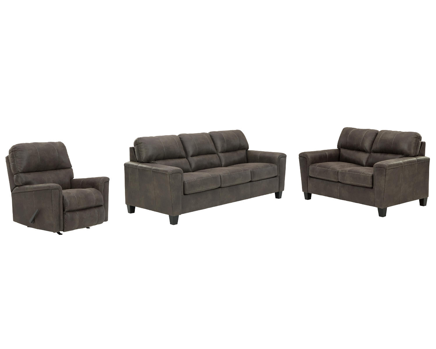 Meet the Navi three-piece seating set: a sofa, a loveseat, and a recliner, all upholstered in Smoke. This contemporary collection is ideal for modern living spaces, media rooms, or family rooms, offering a cohesive look and dependable comfort for everyday moments.