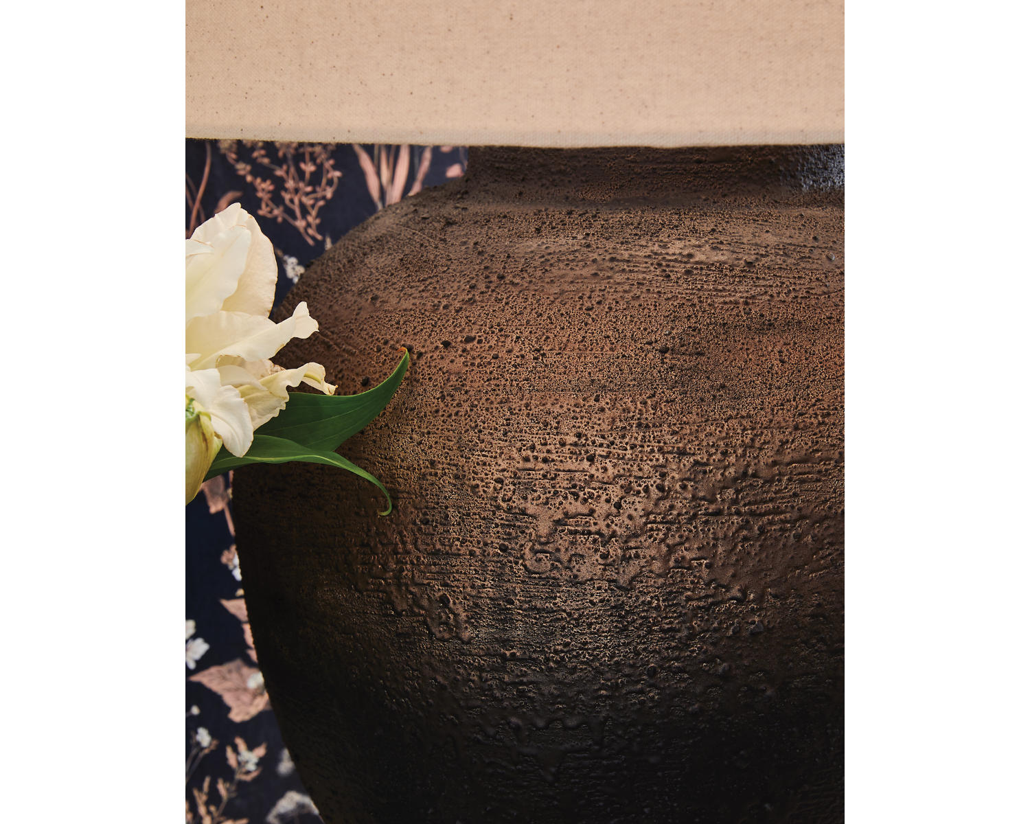 The Newgerhard Table Lamp brings a touch of modern metalwork to desks, nightstands, or accent tables. Finished in a stylish brown and black, it pairs durability with everyday elegance for living rooms, bedrooms, or home offices.