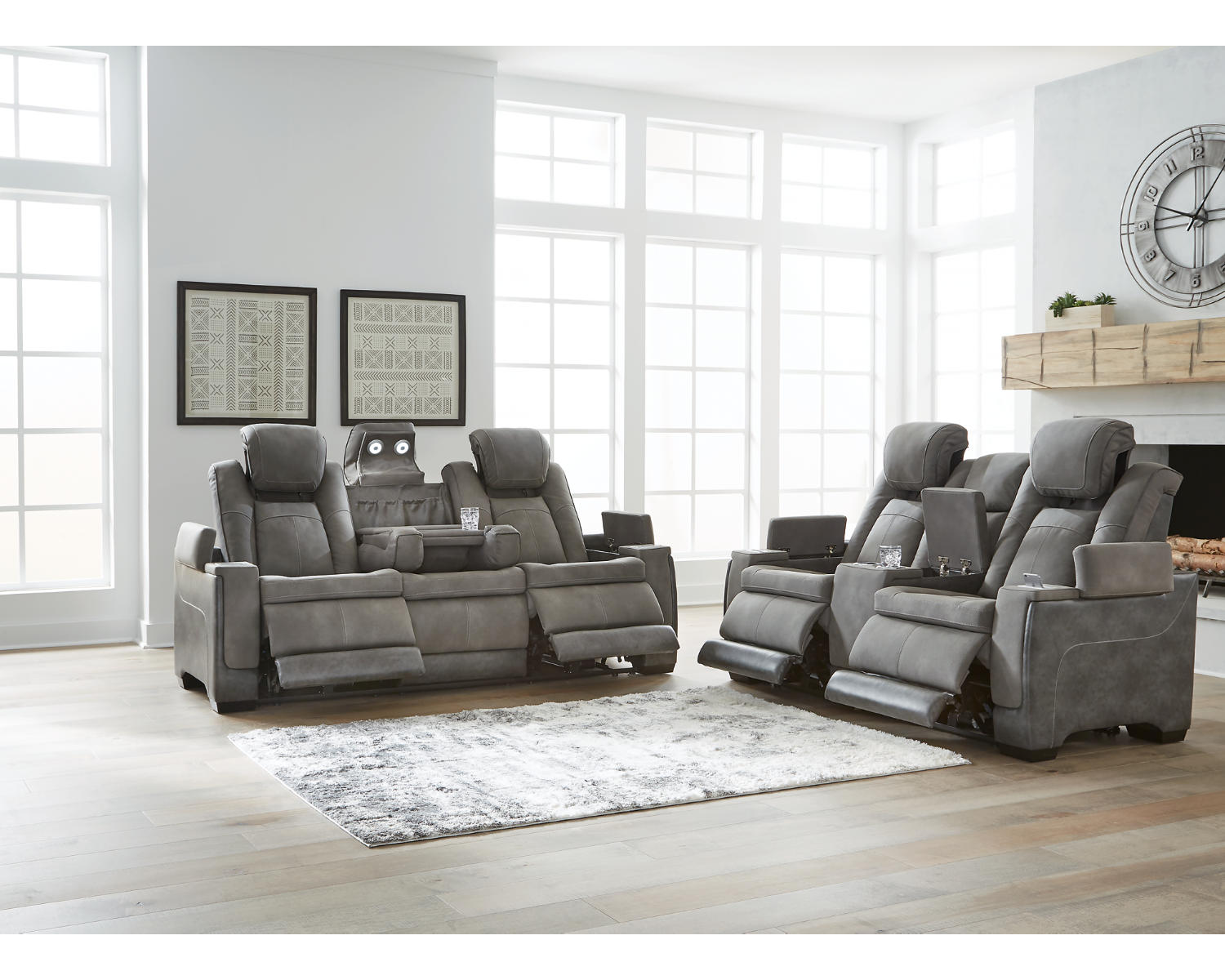 - Two-piece set featuring a spacious power reclining sofa and a matching power reclining loveseat for a cohesive seating arrangement