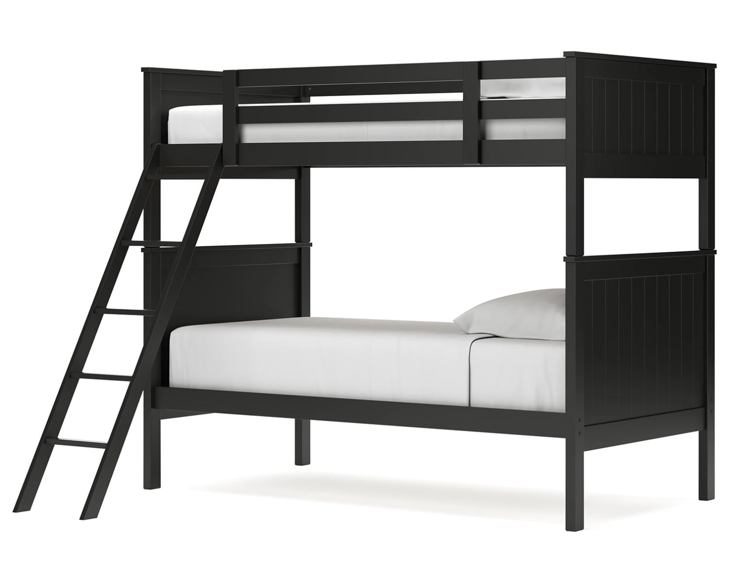 The Nextonfort Twin over Twin Bunk Bed is a space-saving sleeping solution designed for shared bedrooms and growing families. With a sleek black finish, it blends contemporary style with practical design to maximize floor space without sacrificing comfort.