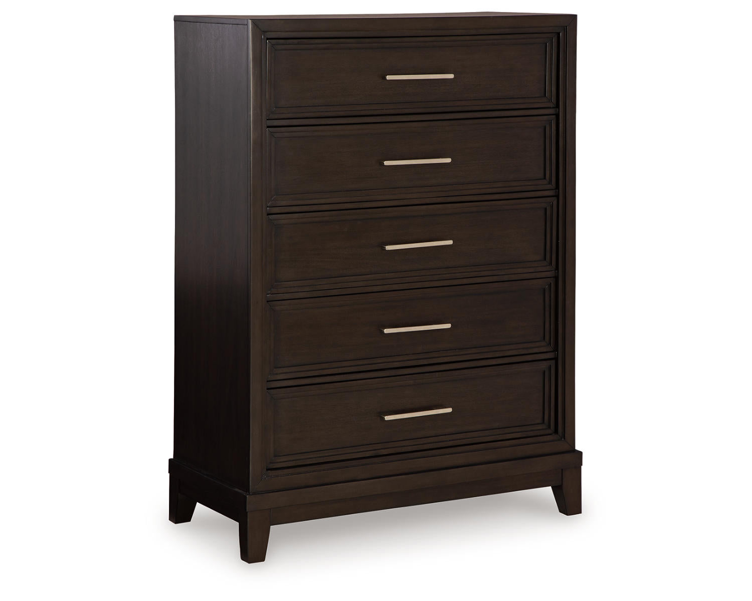 The Neymorton Chest of Drawers is a versatile storage piece built for bedrooms, guest rooms, or entryways. It features five drawers for organized clothing and essentials in a dark grayish brown finish that suits a range of decors. This chest blends clean lines with practical storage to help you keep spaces tidy and stylish.