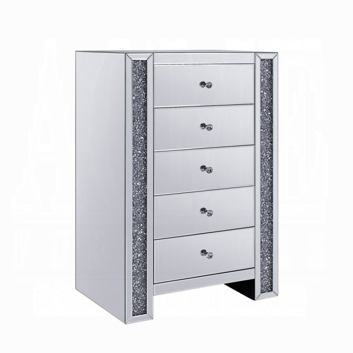 The Noralie Cabinet brings a touch of glamour to any room. This contemporary mirrored cabinet features a stunning mirror top and faux diamond inlays on each leg of its sled base. With five large drawers, it combines stylish appeal with practical storage for everyday living.
