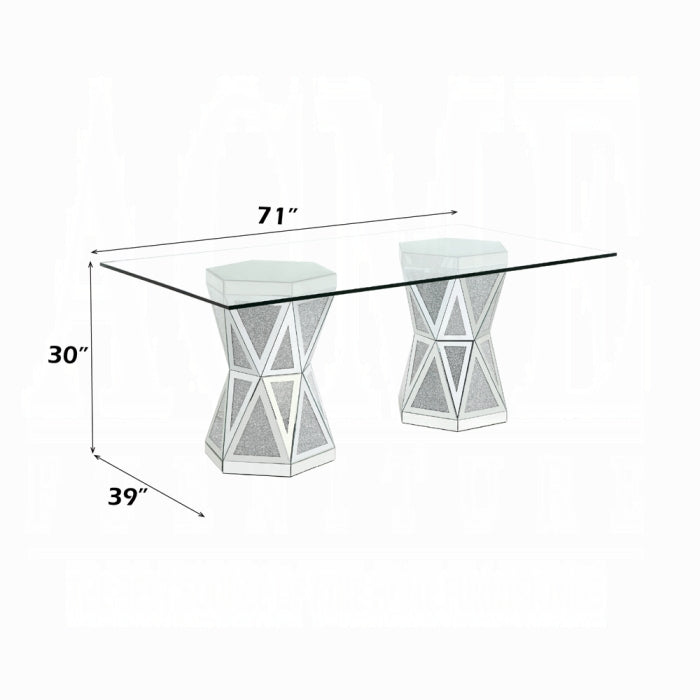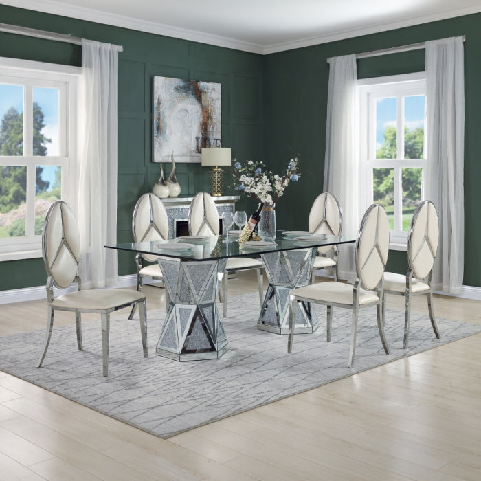 Introducing the Noralie dining table — a pure glamour focal point for modern dining spaces. Crafted for those who appreciate luxury with clean lines, tempered glass, and mirrored panels. The faux diamonds add the perfect finishing touch to elevate every meal. Pair it with tufted chairs to complete a refined dining experience.