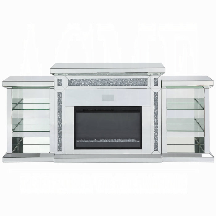 Introducing the Noralie Fireplace with LED & Bluetooth — a striking centerpiece that blends luxury detailing with everyday practicality. Framed with glimmering faux diamonds and encased by brilliant mirrors, this unit elevates any room with a touch of glamour. The warm LED glow creates inviting ambiance, while the lighted bookend shelves offer practical storage for reading materials, media accessories, or pottery. Control from anywhere in the room with the easy-to-use remote, and enjoy Bluetooth compatibility for seamless audio integration.