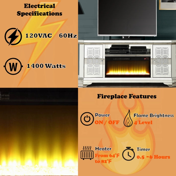 Meet the Noralie TV Stand with Fireplace—a modern centerpiece built for living rooms that crave both style and function. This elegant console combines a mirrored finish with faux diamond accents to elevate your space, while its built-in fireplace feature adds ambient warmth. Crafted from a sturdy composite wood frame, it’s designed to support your entertainment setup with lasting appeal.