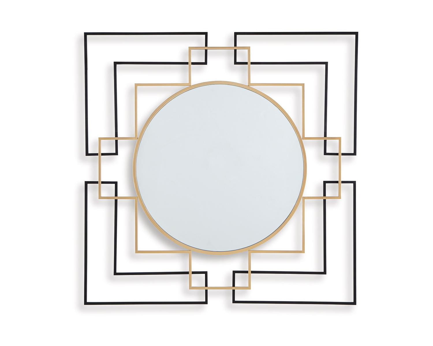 The Oceanal Accent Mirror features a striking black and gold finish that adds a touch of elegance to any wall. This decorative mirror reflects light to brighten spaces while providing a sophisticated focal point. It's a versatile accent piece suitable for living rooms, hallways, or bedrooms.