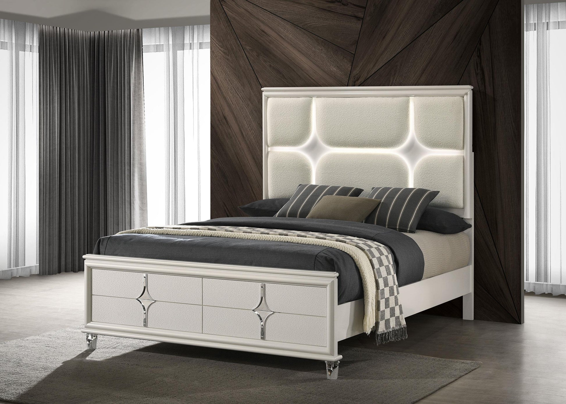 Olivia Queen Panel Bed LED Headboard Pearl White