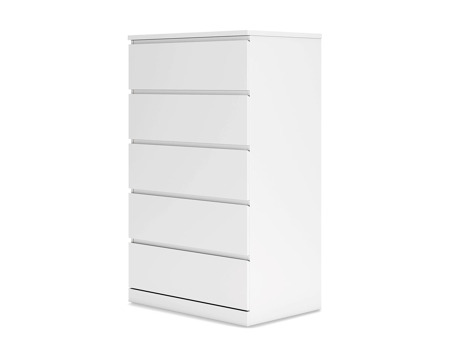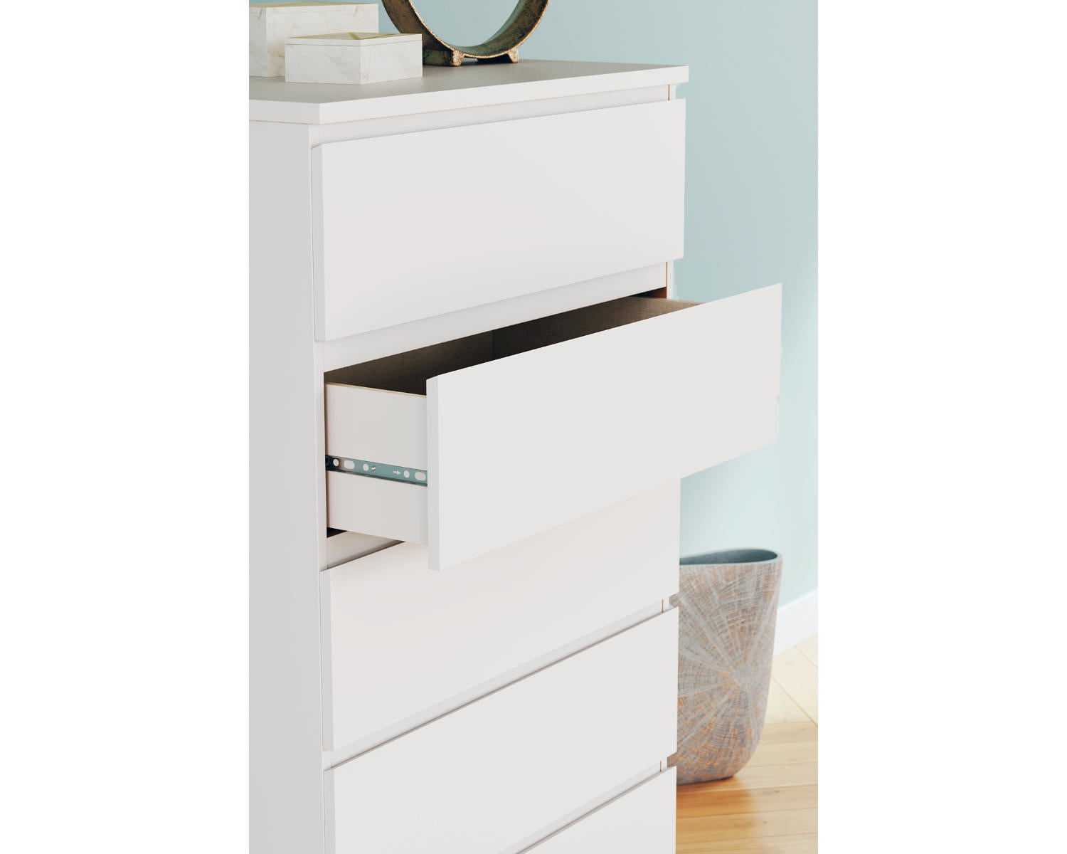 Introducing the Onita five-drawer chest in a crisp white finish—an ideal storage solution for bedrooms, guest rooms, or dressing spaces. This compact piece offers organized storage for clothes and accessories while adding a clean, timeless touch to any décor. Designed for daily use, it delivers reliable function with simple, modern style.