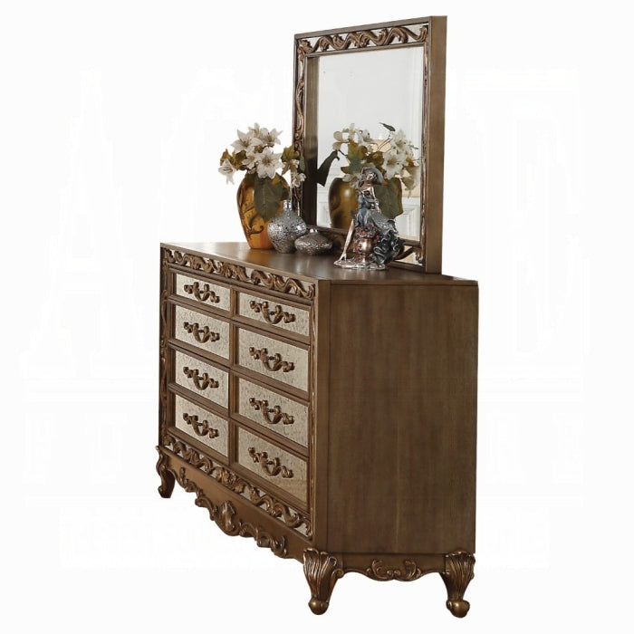 Meet the Orianne Dresser—a refined storage piece that blends timeless vintage charm with practical organization. Crafted for bedrooms and living spaces that value warmth and elegance, this dresser adds a touch of antique luxury while keeping everyday use in mind. Its bold silhouette and mirrored accents create a sophisticated focal point that complements both classic and contemporary interiors.