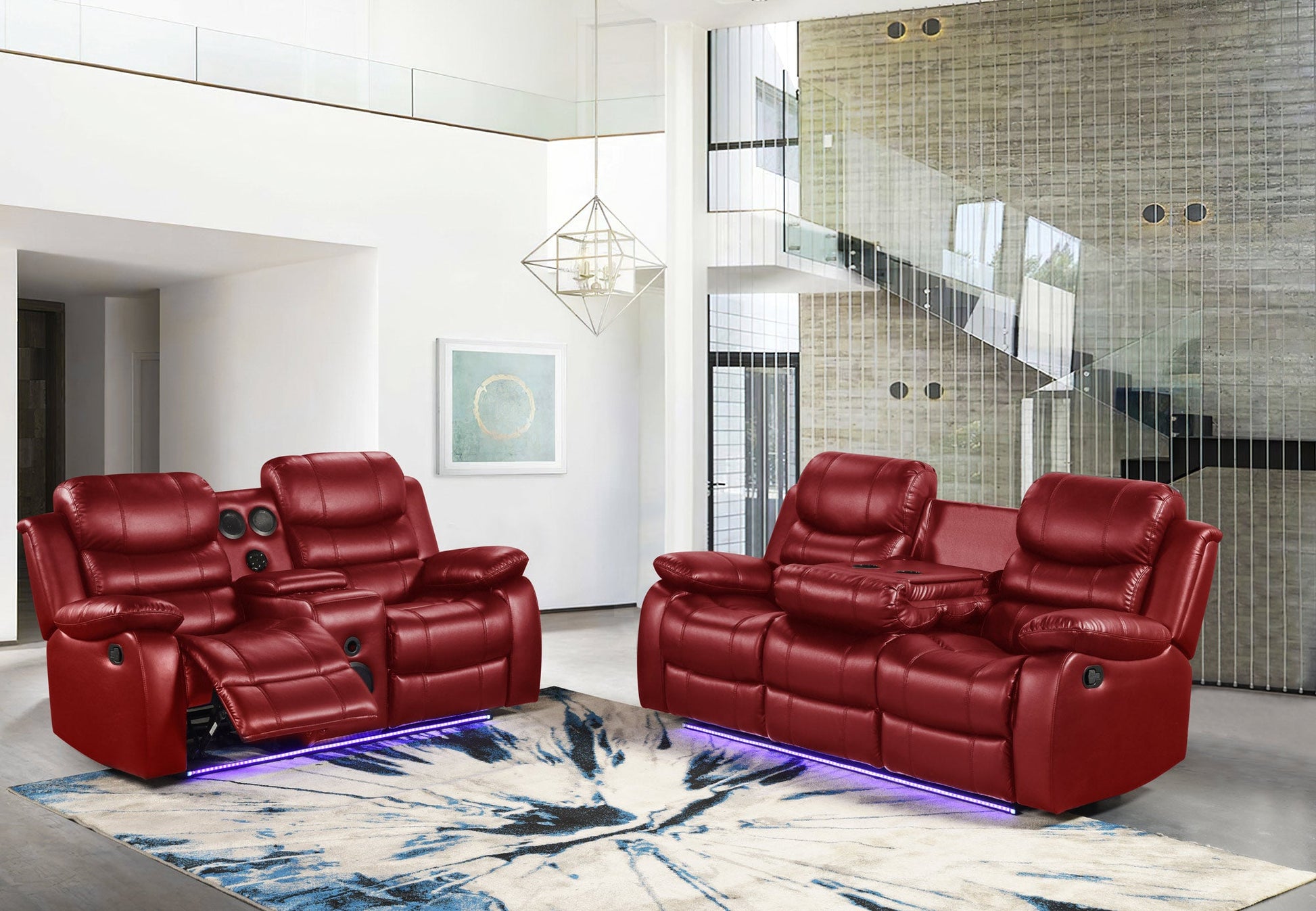 Experience modern comfort with the Orlando Collection, a contemporary reclining sofa set designed for ultimate relaxation. Upholstered in bold burgundy faux leather, it combines striking style with plush cushioning for everyday lounging. Built-in reclining mechanisms invite a personalized lounging experience, while cup holders and storage compartments keep essentials within reach.