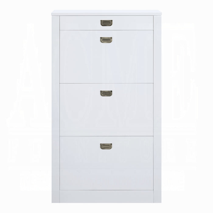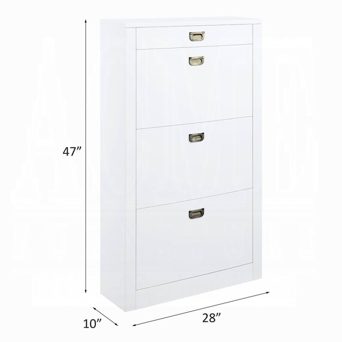 The Pagan Shoe Cabinet combines a durable composite wood frame with sturdy metal hardware to deliver lasting reliability for daily use. The white high-gloss finish resists scuffs and wipes clean easily, helping maintain a pristine look with minimal effort. Its compact footprint fits into entryways, bedrooms, or closets while keeping footwear neatly organized and accessible. With a capacity of 18 shoes and a solid 73-lb build, Pagan offers a practical storage solution at a competitive price point without compromising on style or function.