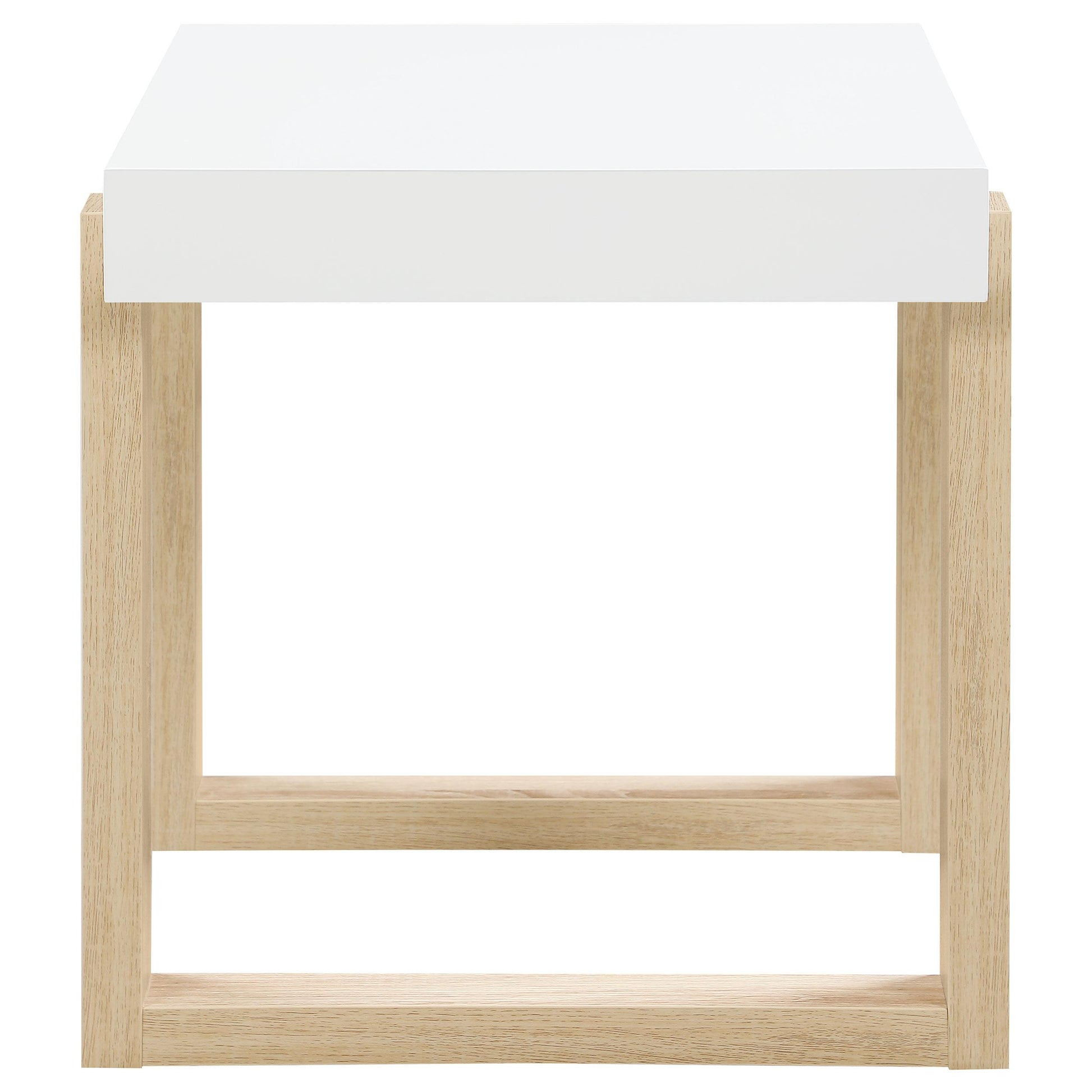 The Pala Rectangular End Table blends a crisp white high-gloss finish with natural wood accents to create a versatile, modern addition to any living space. Designed for living rooms, bedrooms, or seating areas, it offers a clean surface and a compact footprint that fits beside sofas, chairs, or beds.