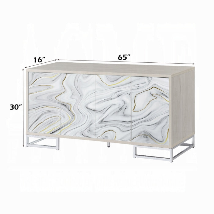 Introduce a refined glow to your entryway or dining room with the Panos Console Cabinet. This luxurious, modern piece features a white neutral finish and clean lines, accented by faux marble door fronts for a timeless glam look.