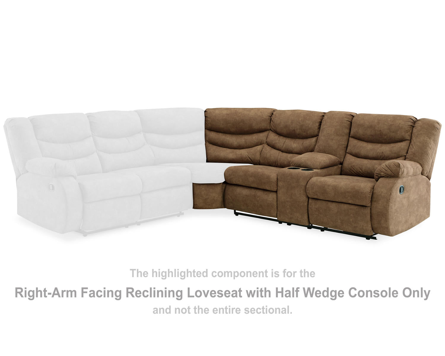 - Configuration: Right-Arm Facing (RAF) reclining loveseat with a built-in half wedge console.