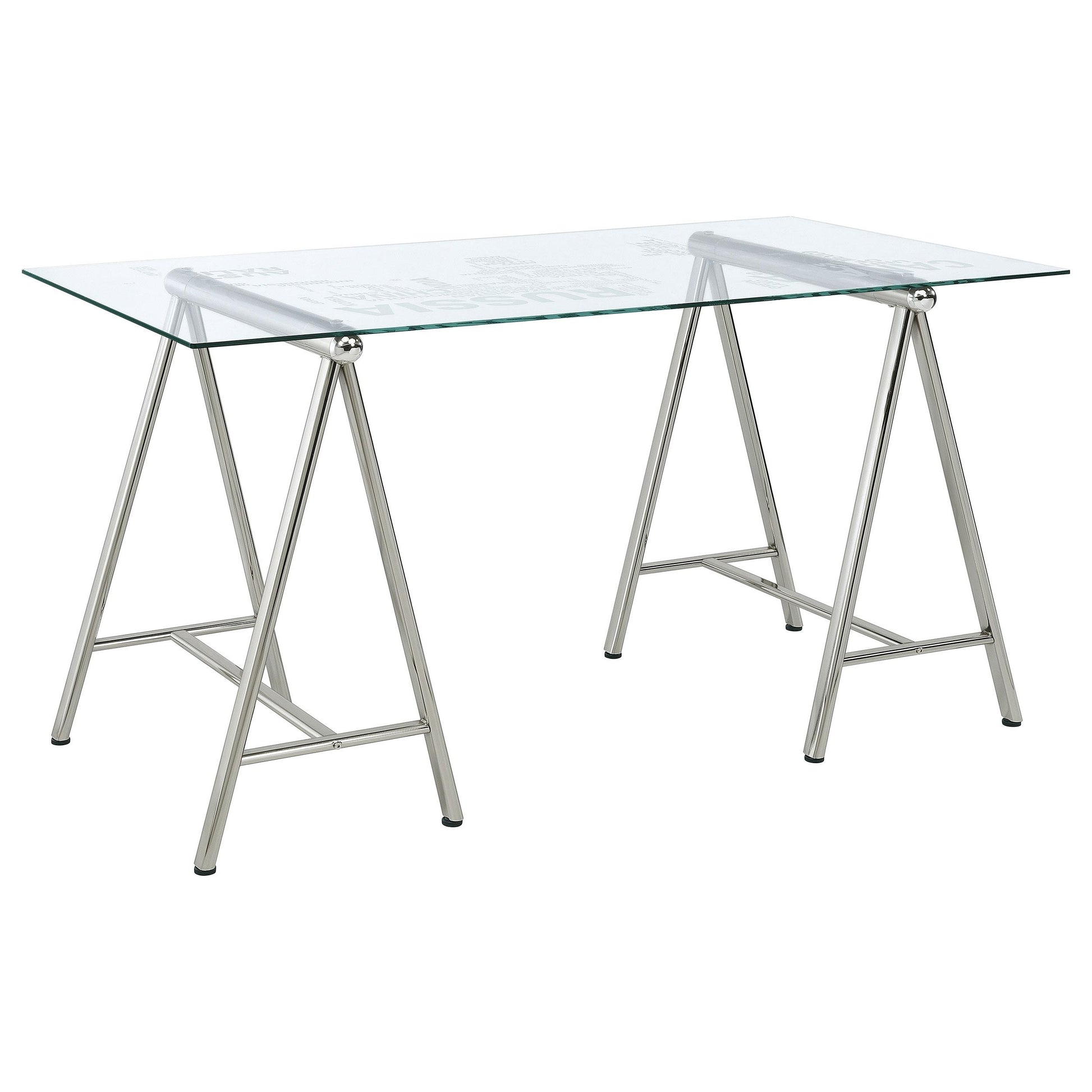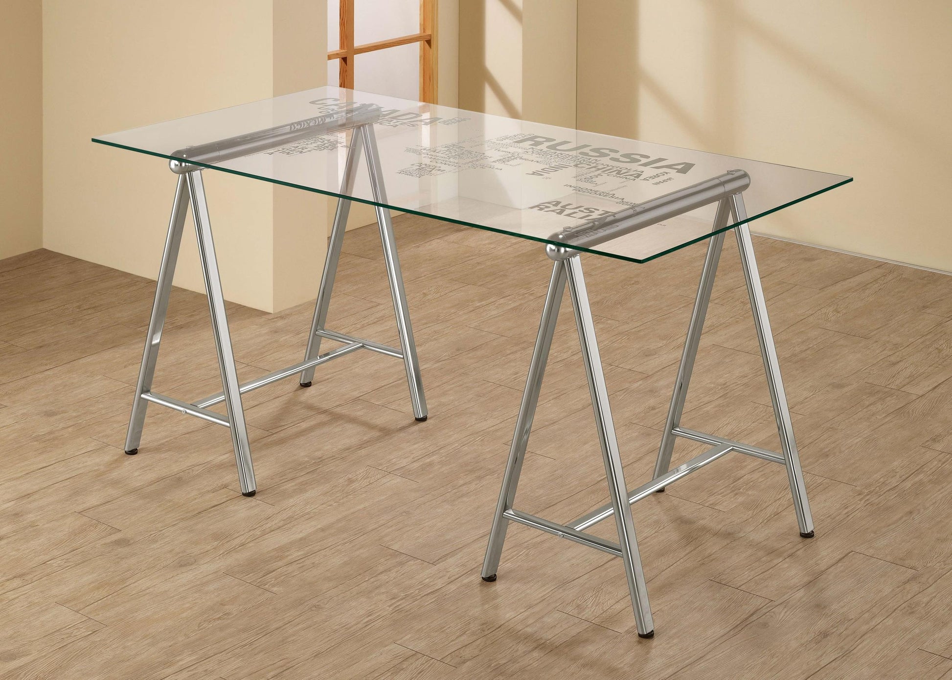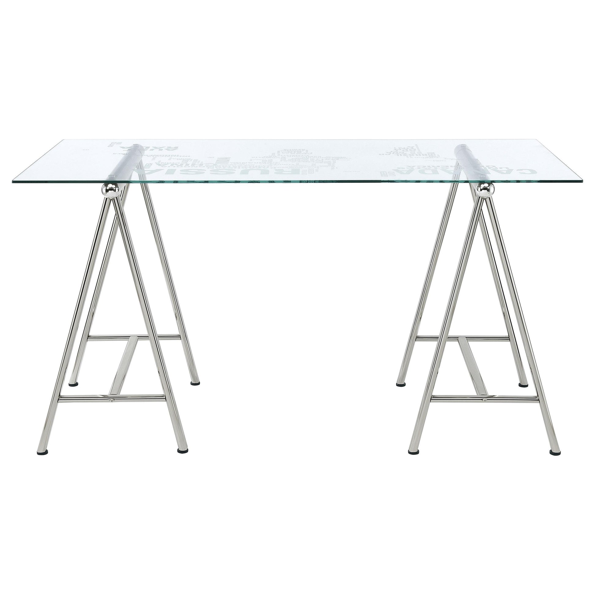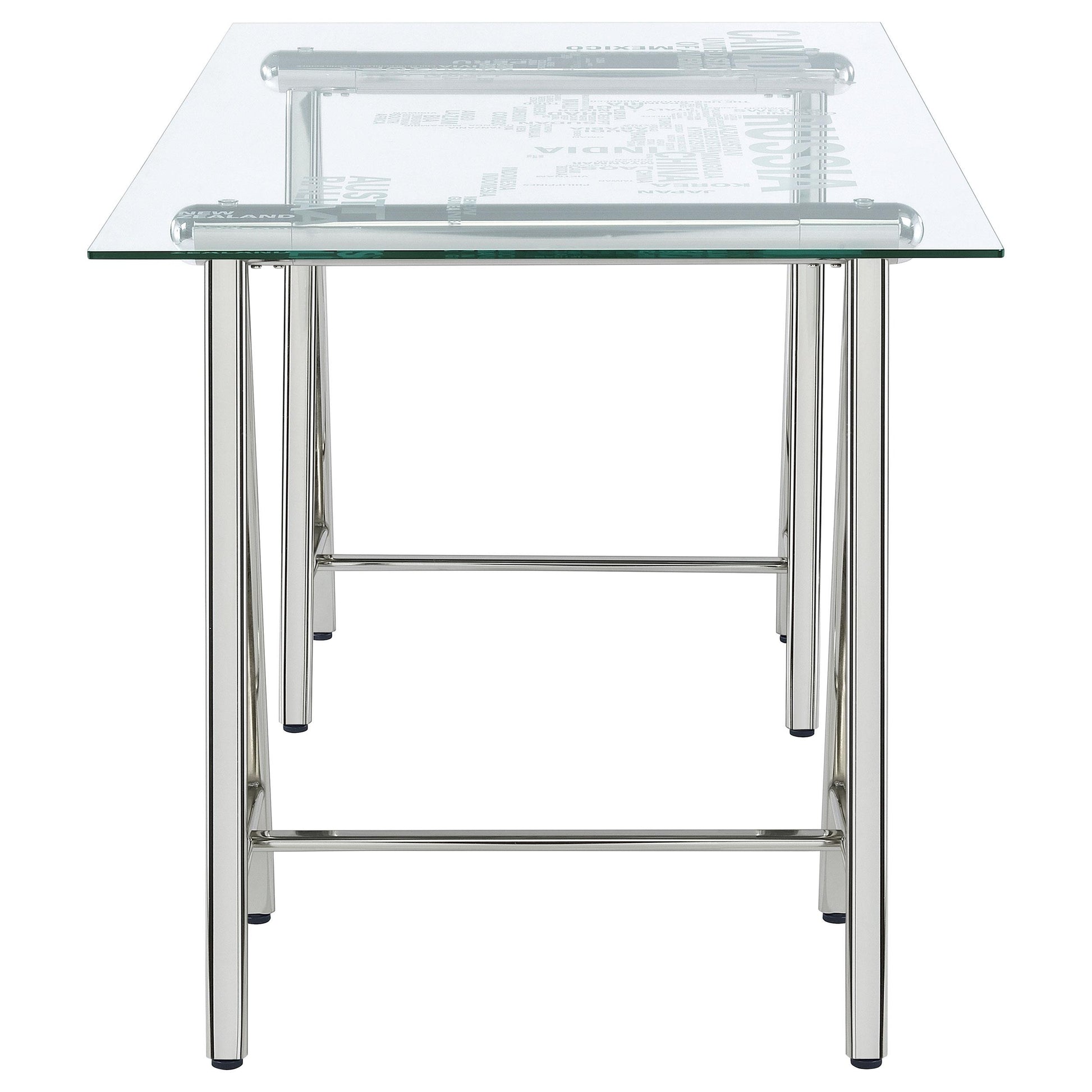 Introducing the Patton 59-inch Glass Top Word Cloud Writing Desk in a sleek nickel finish. This spacious workstation is ideal for home offices, study zones, or creative corners. A large glass surface combines with a modern metal frame to deliver a clean, contemporary look with practical writing and computer space.