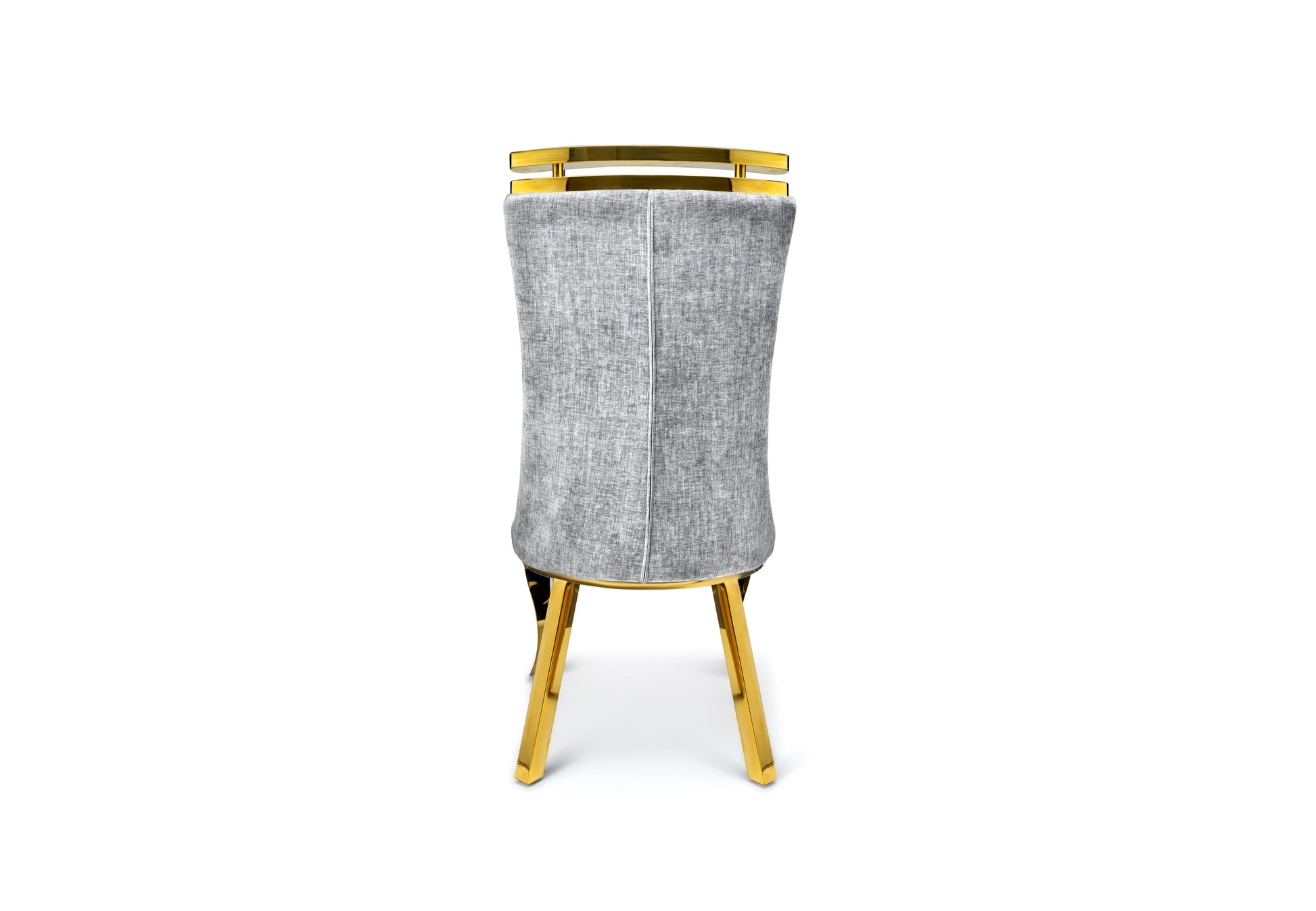 Meet the Pavilion Dining Chair — a pair of modern dining chairs crafted for comfort and style. With luxurious grey upholstery on the seat and back, they offer a refined seating experience for everyday meals and special occasions. The gold-finished stainless steel frames add an elegant touch that elevates any dining space.