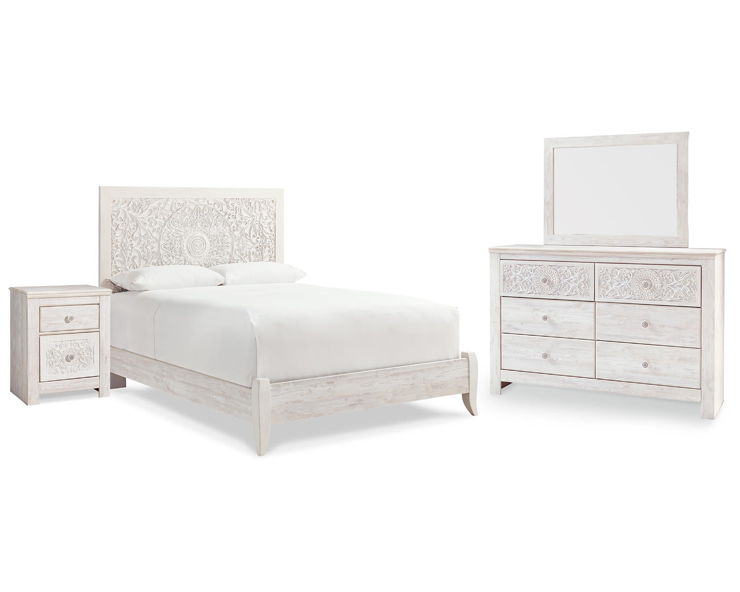 Paxberry Queen Panel Bed, Dresser, Mirror and Nightstand – Whitewash