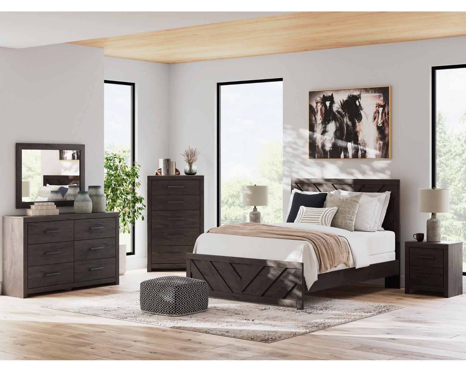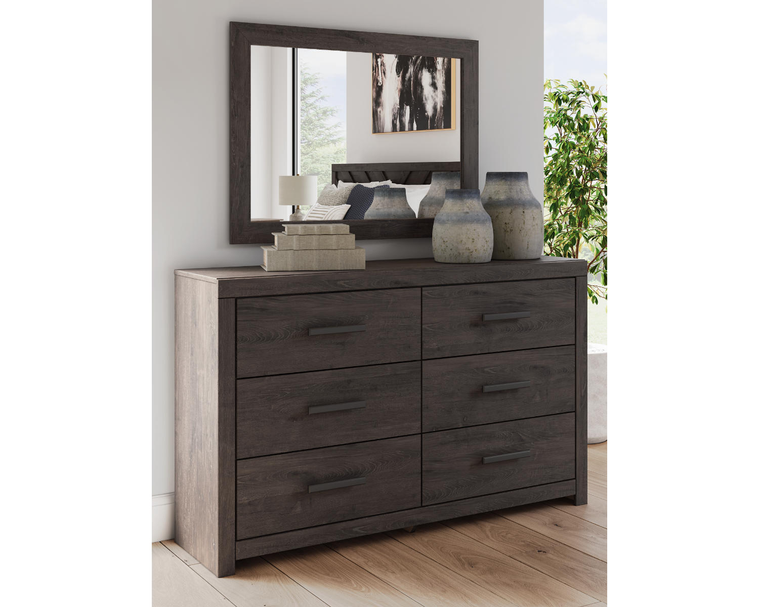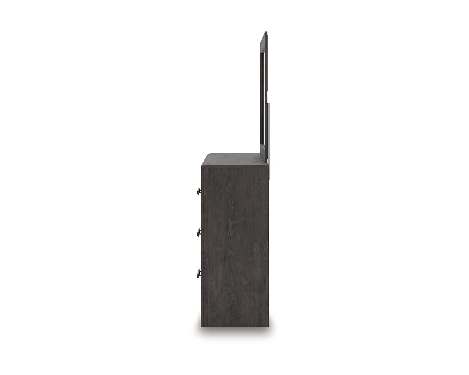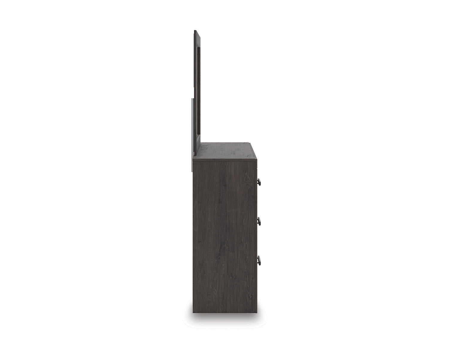 Meet the Prendonea Dresser and Mirror in Charcoal — a streamlined storage solution that brings clean lines and practical function to modern bedrooms. Designed for those who value organized space and a cohesive look, this dresser-and-mirror duo offers ample storage with a contemporary silhouette.
