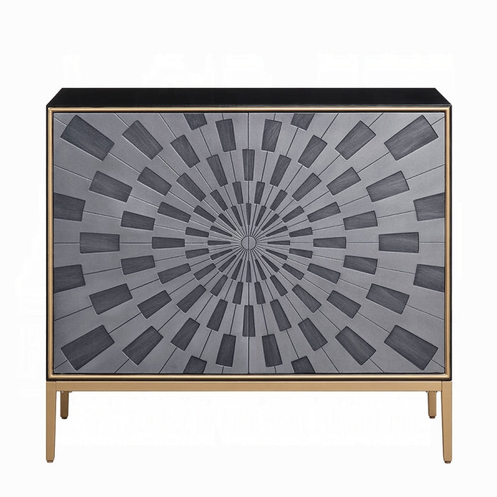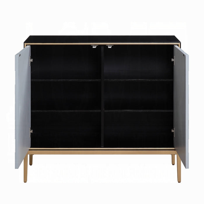 The Quilla Console Cabinet is a rectangular accent storage piece designed for entryways, living rooms, or dining spaces. It features two doors with an interior shelf, sturdy metal legs, and a refined Black, Gray & Brass finish that blends modern style with practical storage.