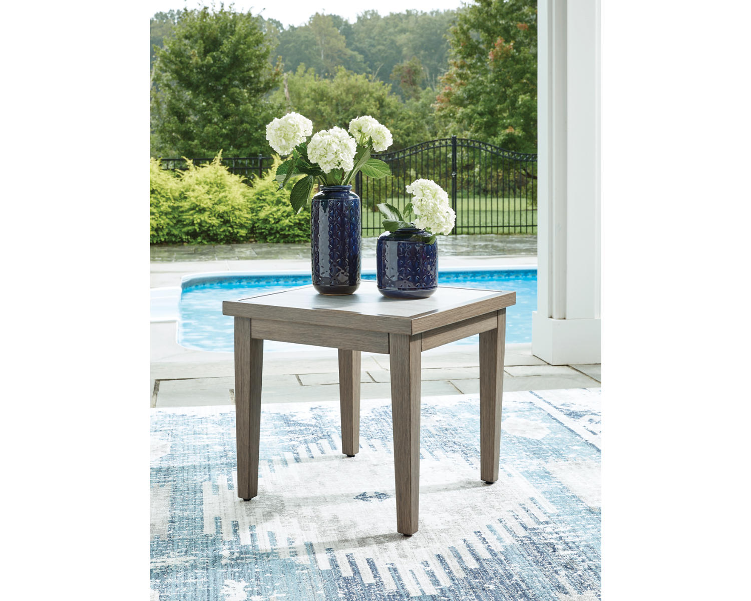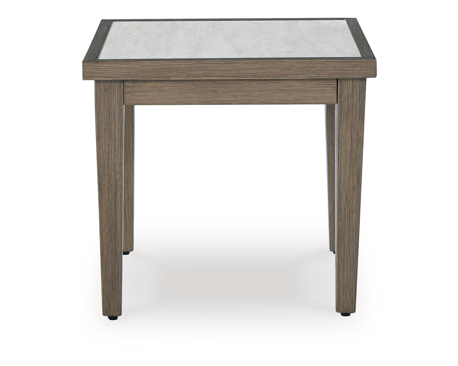 Introducing the Rainier Ranch Outdoor End Table, a square, brown/beige accent piece designed for outdoor living. Perfect beside patios, decks, or balconies, it keeps drinks, books, and decor within easy reach while blending effortlessly with natural surroundings. Its neutral tones and compact silhouette make it a versatile addition to any seating area.