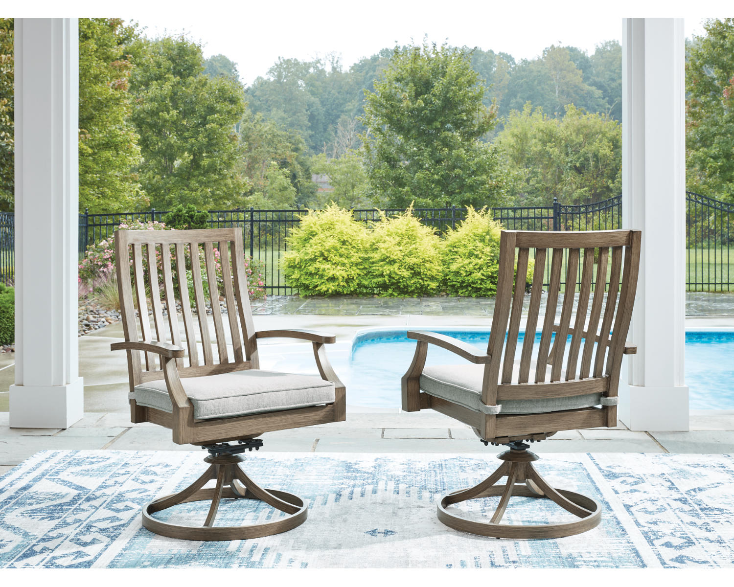Meet the Rainier Ranch Outdoor Swivel Chair with Cushion, a versatile seating solution designed for outdoor living. This set of two chairs brings smooth 360-degree swiveling and comfortable seating to patios, decks, or poolside lounges. With a classic brown frame and beige cushions, the duo blends easily with most outdoor décor while inviting relaxed conversations and leisurely moments.