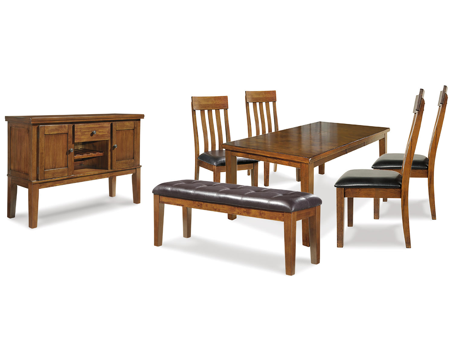 Discover the Ralene dining ensemble—a complete set that includes a table, four chairs, a bench, and a server. Designed for gatherings and everyday meals, it offers a cohesive look in a warm Medium Brown finish. This versatile arrangement fits compact dining spaces while inviting comfortable seating for family and friends.