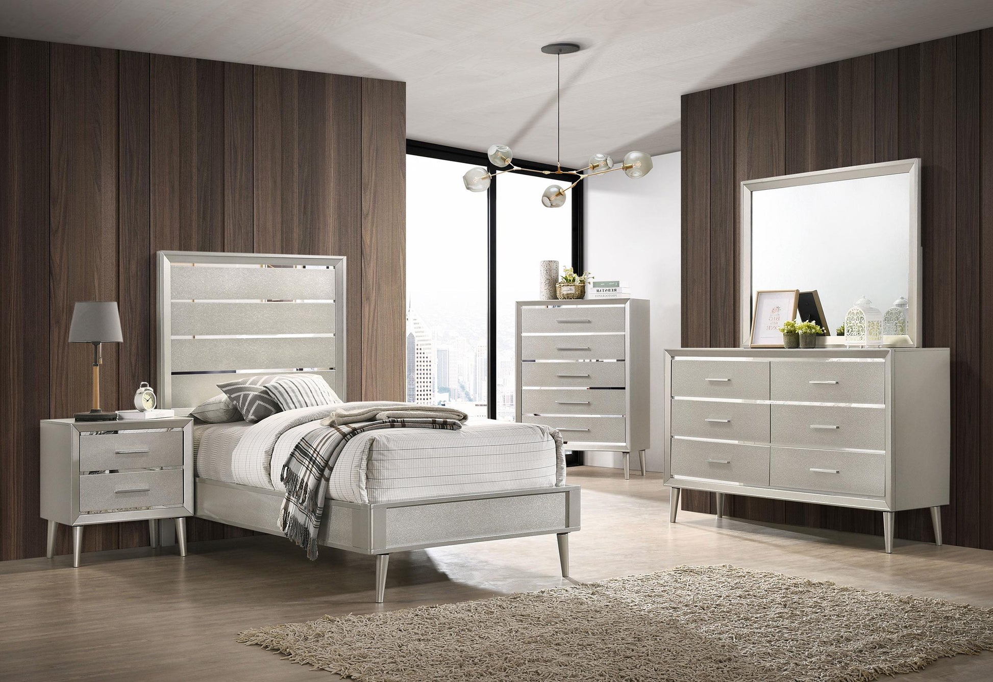 Meet the Ramon 4-piece Twin Bedroom Set in a Metallic Sterling finish — a cohesive, modern solution for a twin-sized bedroom. Designed for bedrooms that need both style and practicality, this set helps you create a polished look with minimal effort. Ideal for teen rooms, guest rooms, or shared spaces, it combines versatility with everyday functionality.