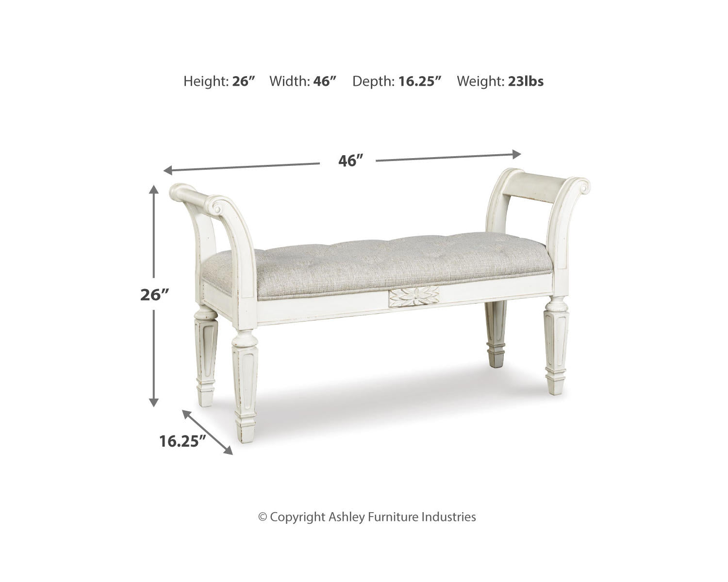 Meet the Realyn Accent Bench — a versatile seating and display piece designed to elevate entryways, living rooms, or bedrooms. Finished in Antique White, it adds a soft, timeless touch while providing a practical surface for bags, books, or decor. This bench blends clean lines with understated charm for spaces that value both style and function.