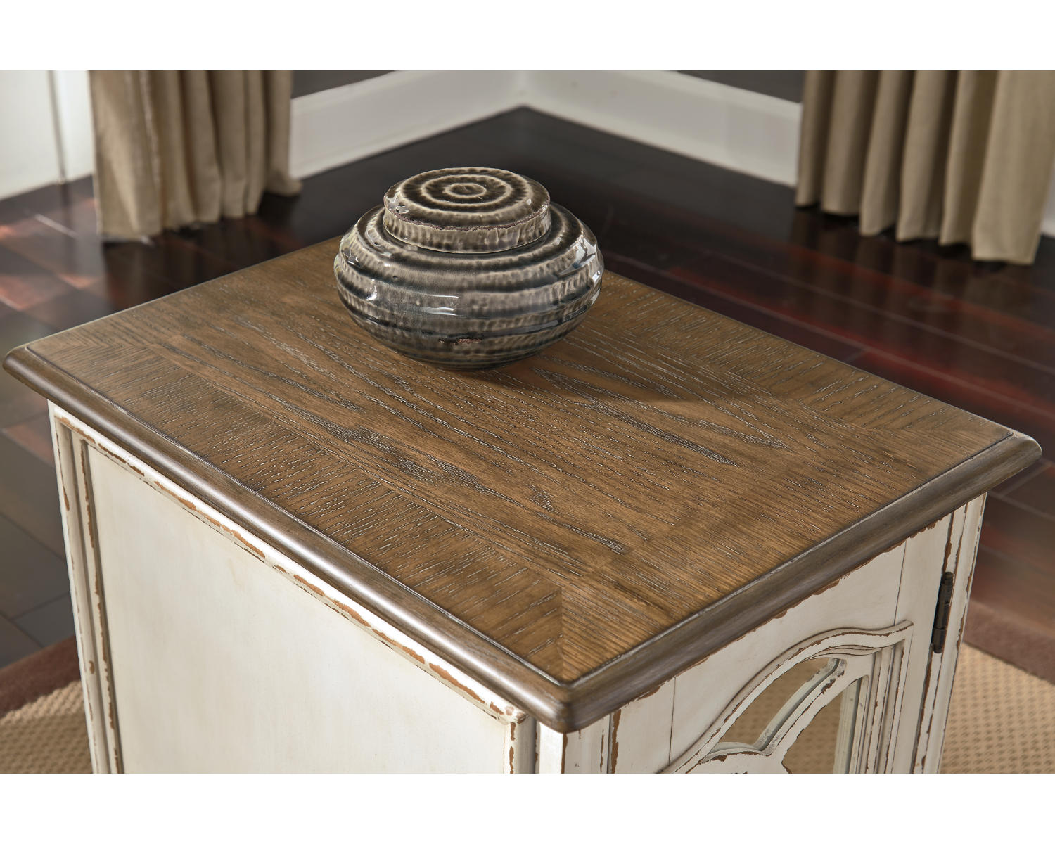 Meet the Realyn Chairside End Table—a practical, two-tone piece designed to sit beside your sofa or chair. Built for everyday living, it provides a ready surface for drinks, remotes, and a small lamp, while its white/brown finish adds warmth to any room. This compact table blends simple lines with versatile style for a clean, modern look.