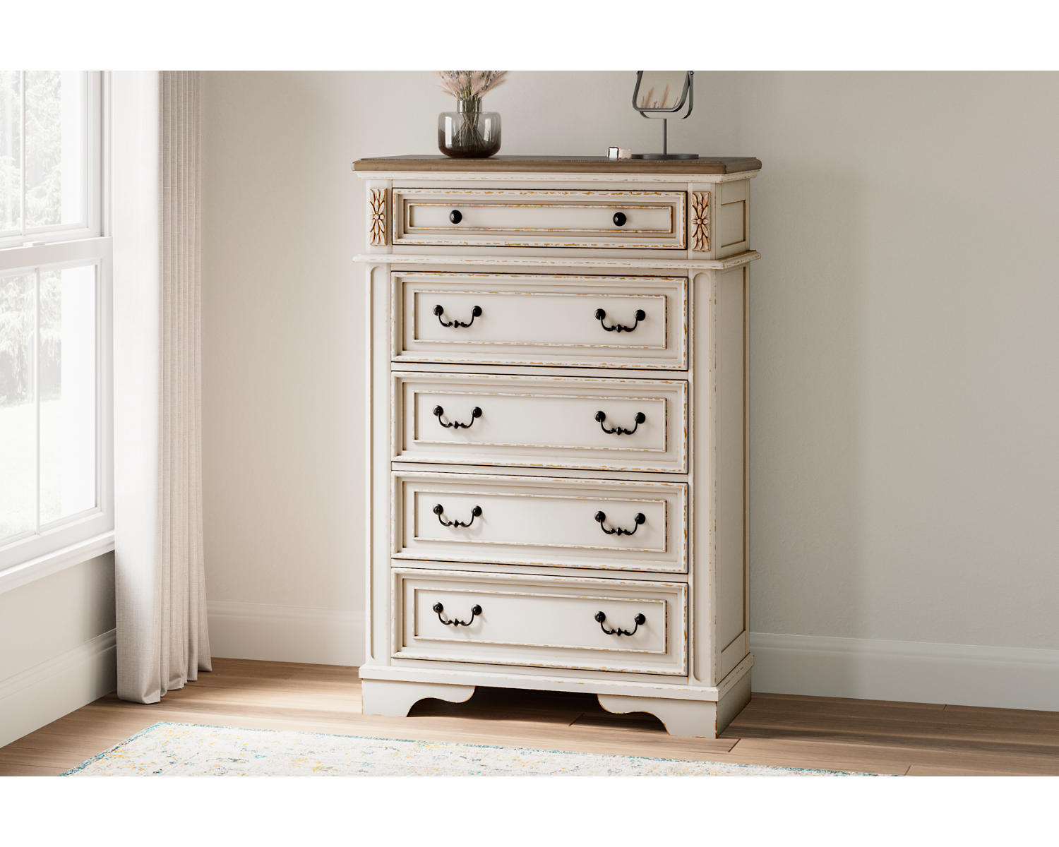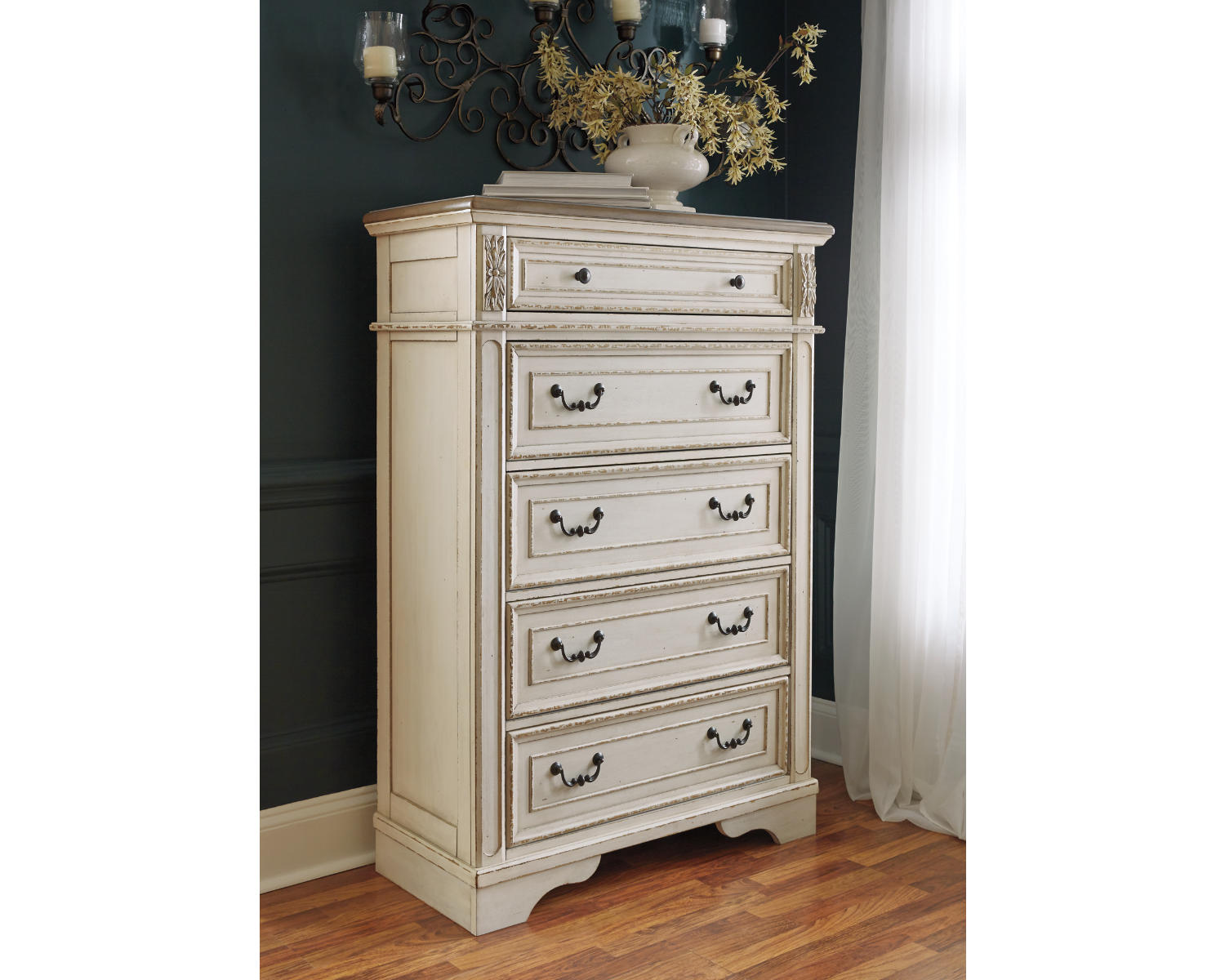 The Realyn Chest of Drawers is a versatile five-drawer storage piece finished in a distinctive two-tone look. Designed for bedrooms, entryways, or living spaces, it combines practical storage with a clean, modern aesthetic. Enjoy organized clothing and essentials with a piece that fits easily into a variety of decors.