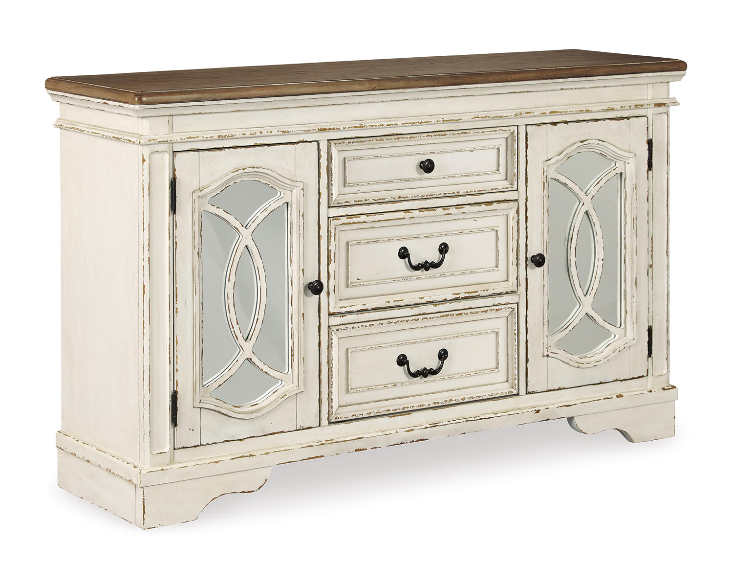 Meet the Realyn dining collection—a complete seven-piece set designed for family meals and entertaining. It includes a dining table, six chairs, and a coordinating server in a versatile chipped white finish. The understated style fits both casual and refined spaces, making your dining room ready for everyday use and special gatherings.