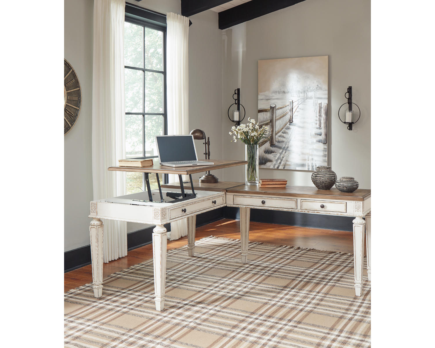 Meet the Realyn Home Office Lift Top Desk—where a clean, two-tone finish meets practical design for compact spaces. This lift-top desk is ideal for home offices, students, or anyone who needs a versatile workspace at home. Its white and brown palette adds a modern touch while keeping essentials within reach.