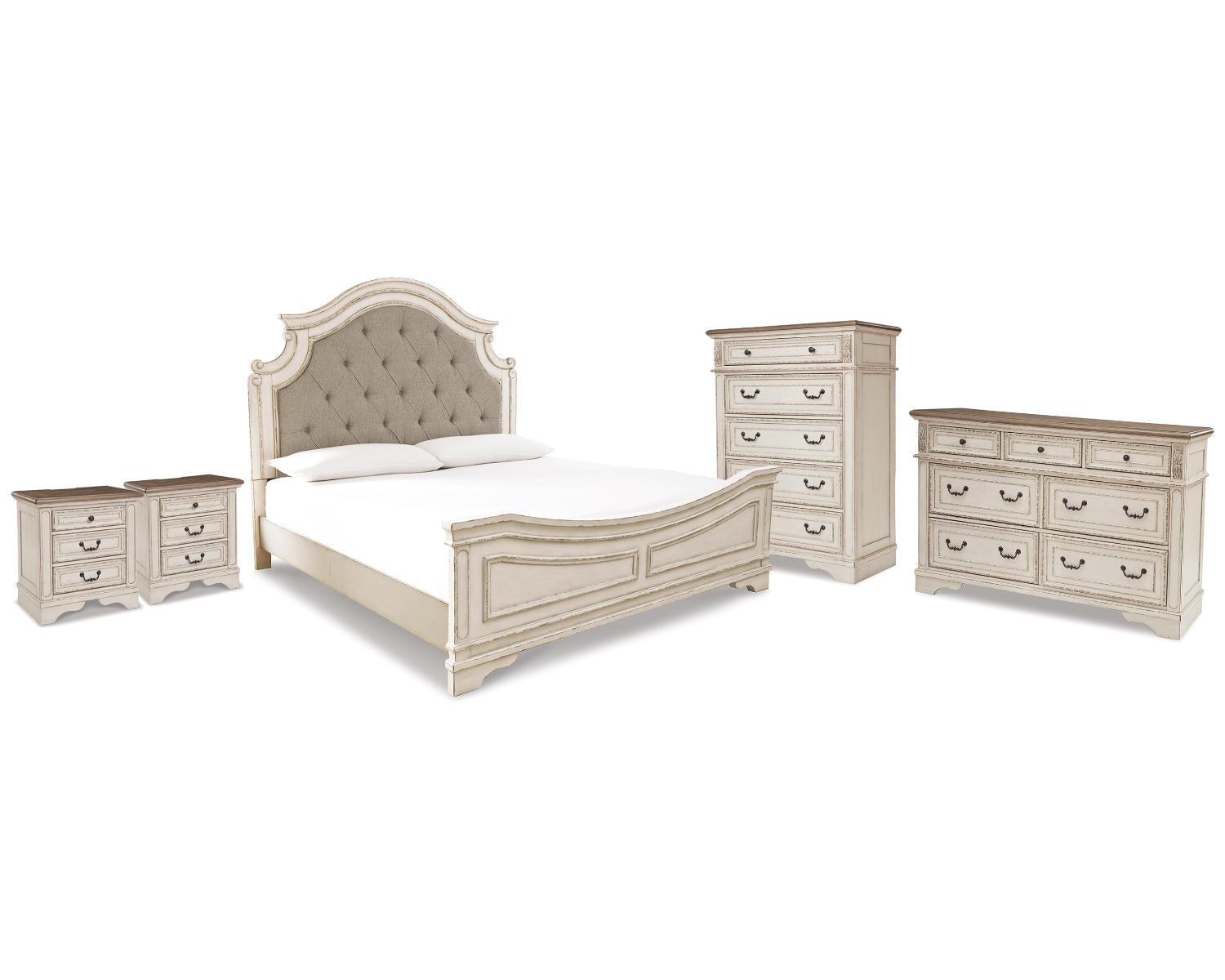 Discover the Realyn King Panel Bed, a complete bedroom suite designed for calm, coordinated style. This set includes a king panel bed, a dresser, a chest, and two nightstands—offering a cohesive look that's ideal for master bedrooms or guest rooms. Built with clean lines and timeless appeal, it brings generous storage and versatile design to your space.