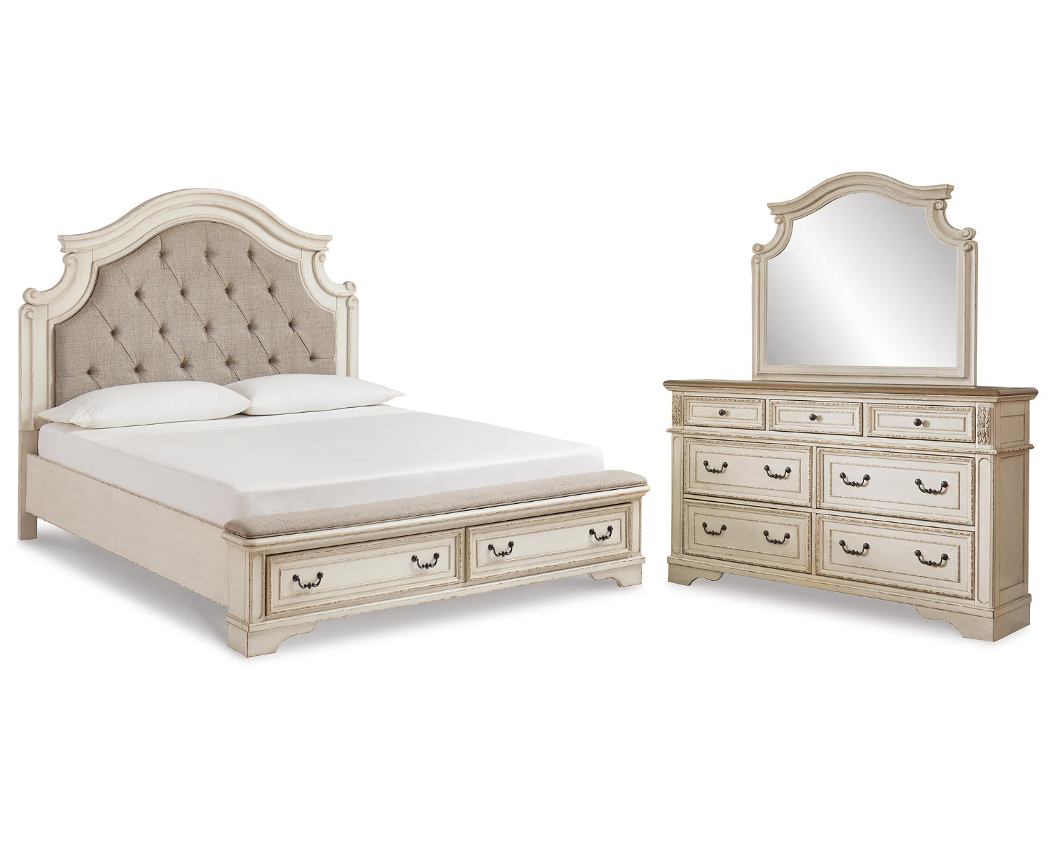 Realyn King Upholstered Bed with Dresser and Mirror - Chipped White