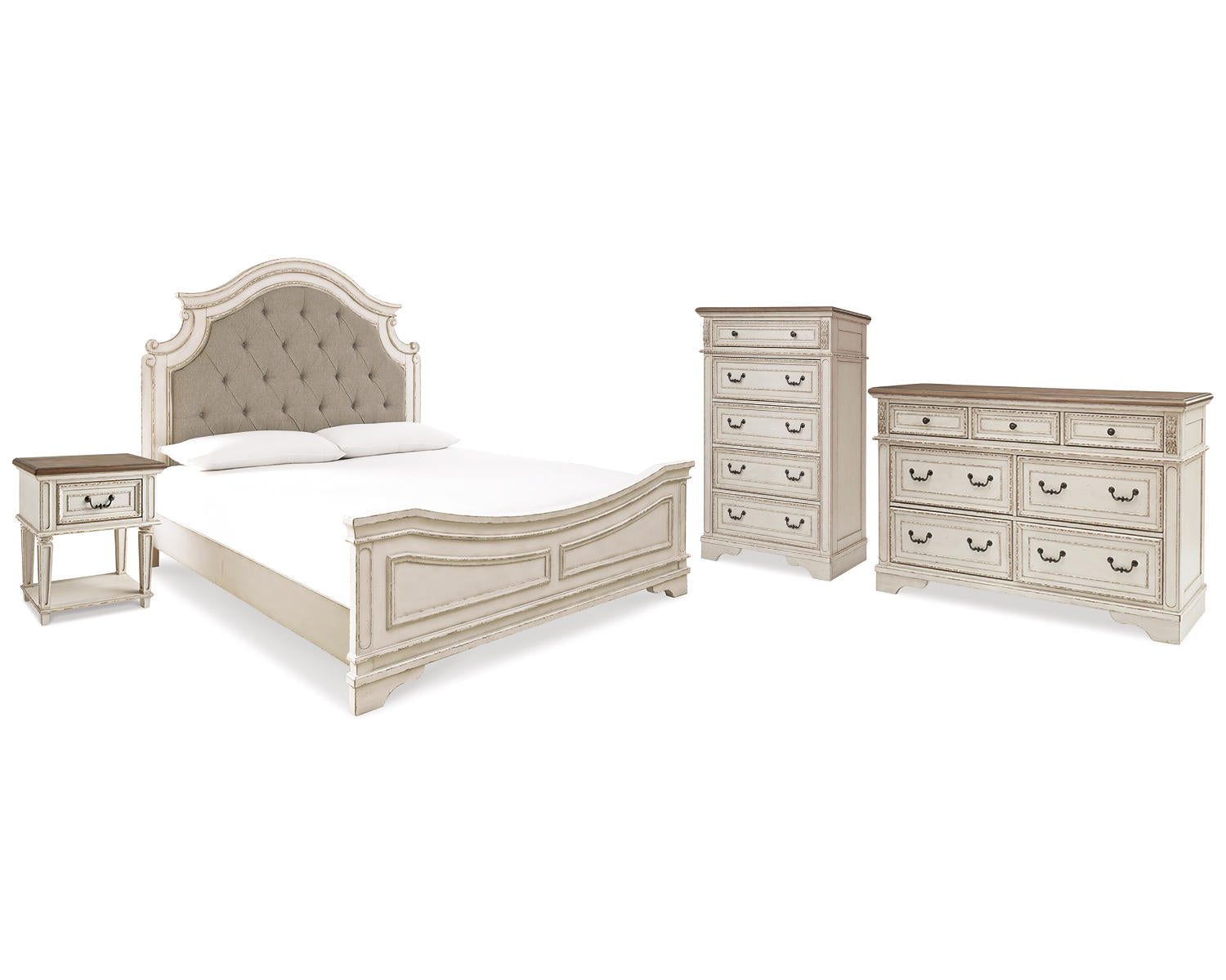 Realyn King Upholstered Panel Bed, Dresser, Chest and Nightstand
